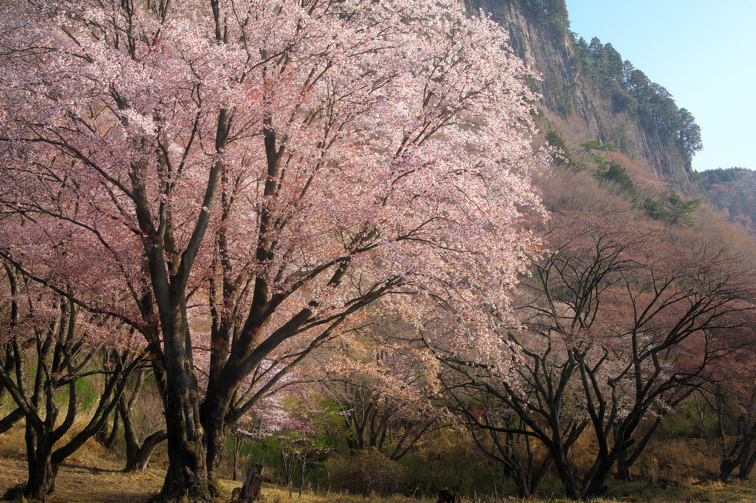 巨大な岩壁を背景に桜の木々が一斉に咲き誇り、