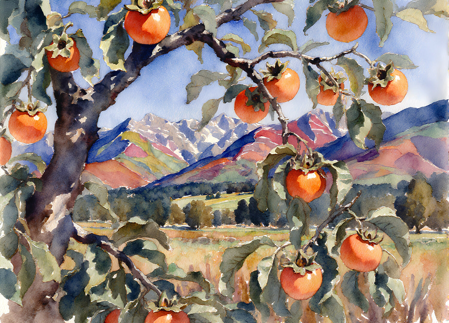 秋が深まり、山の木々が色づいて柿が熟しています。