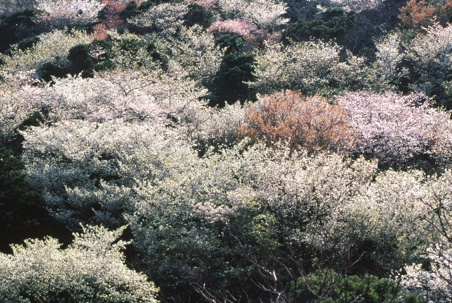 山肌に自生する様々な種類の山桜、色合いを対比。