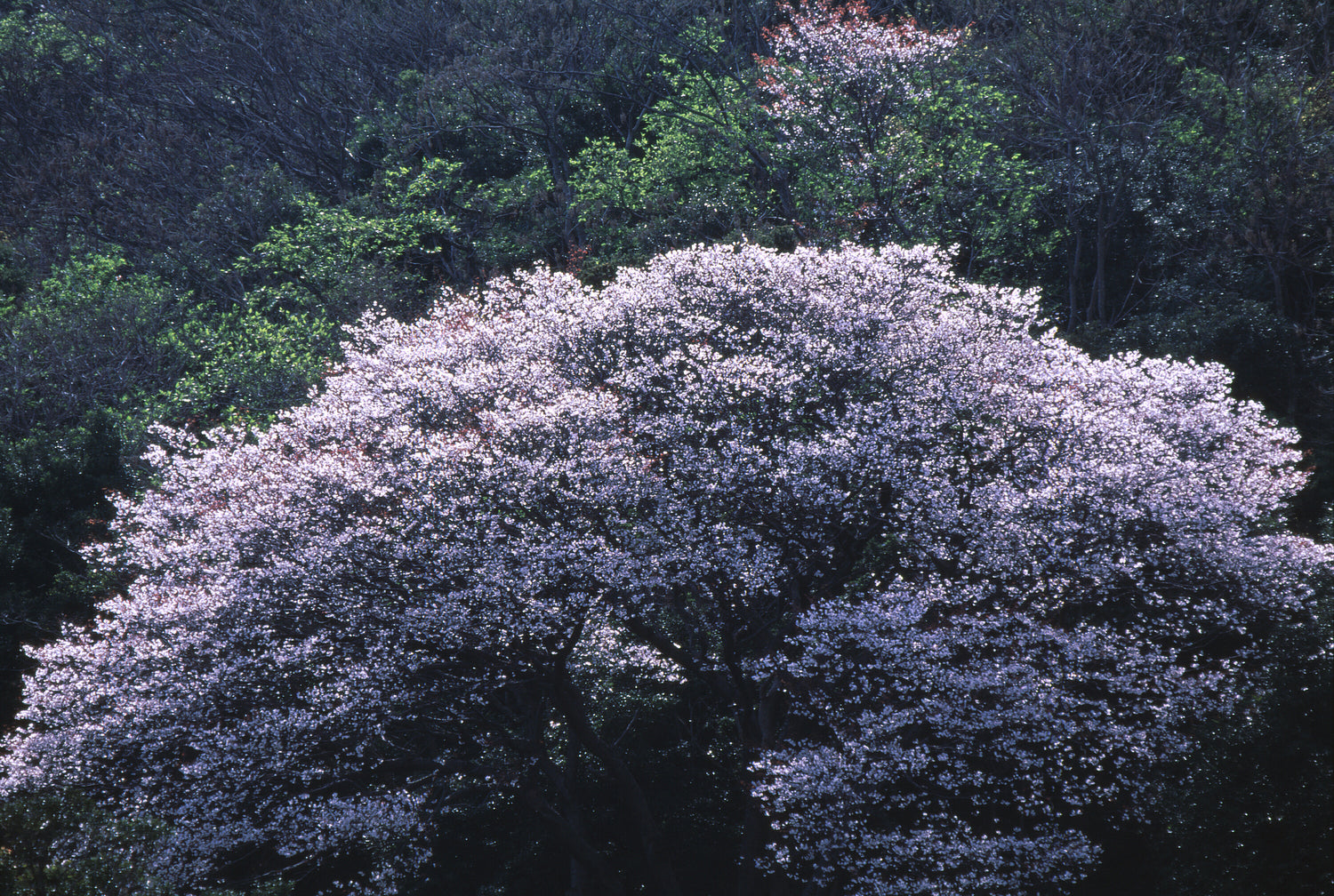 満開の山桜と、周辺の新緑を取り入れて季節感を表現。