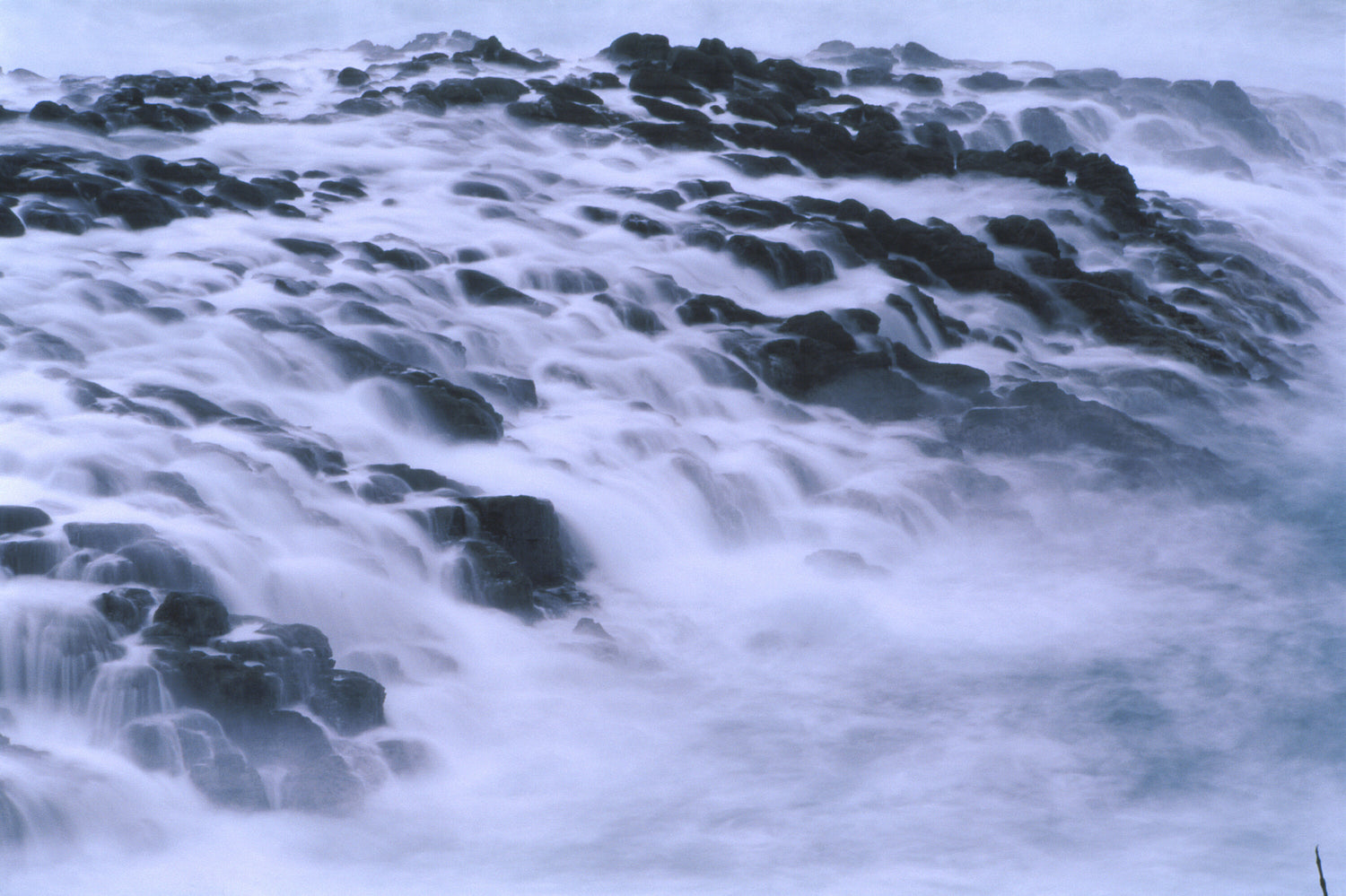 岩礁に当たって砕ける白波を、スローシャッターで雲のように表現。