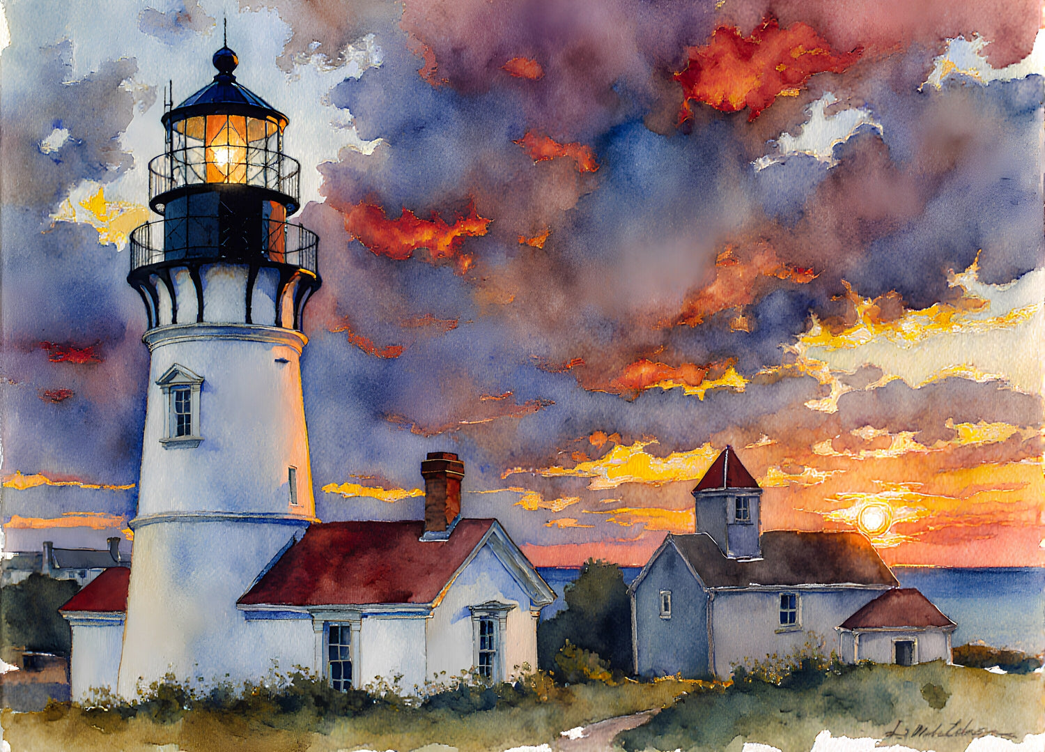 秋の夕暮れ時、灯台に灯りがつき、太陽とともに黄色く光っています。