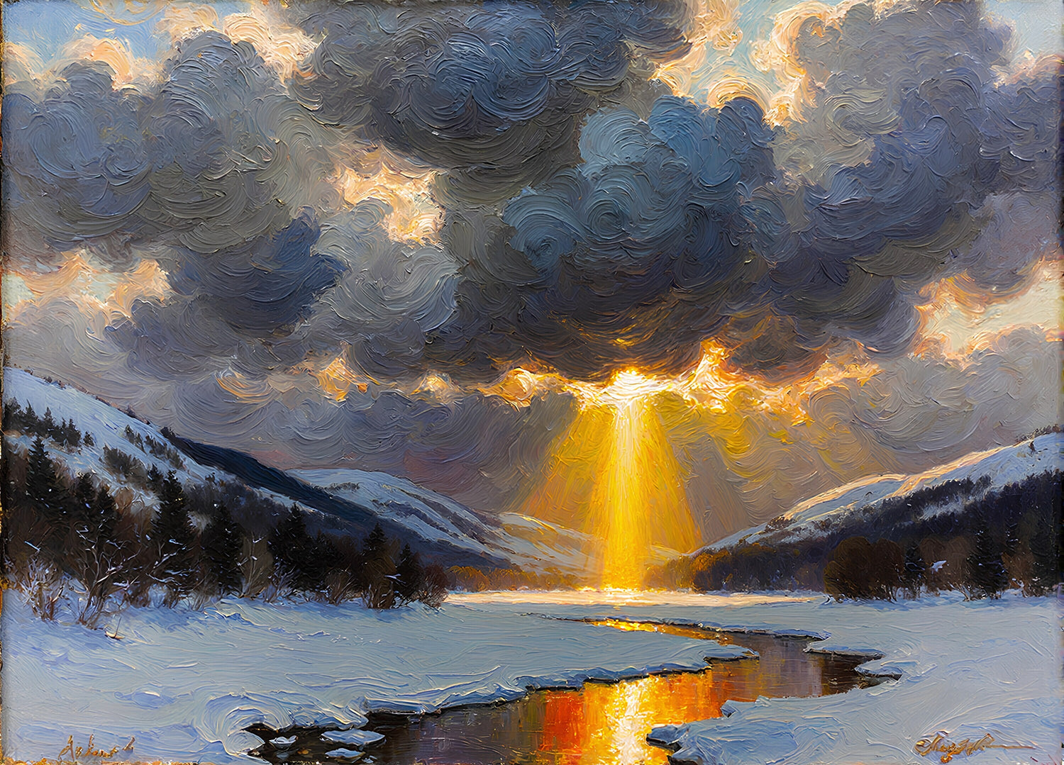 深い藍色とグレーの重く荒れ狂う雪雲が裂け、地平線から目がくらむほど強烈な黄金色の日の出が現れている。
