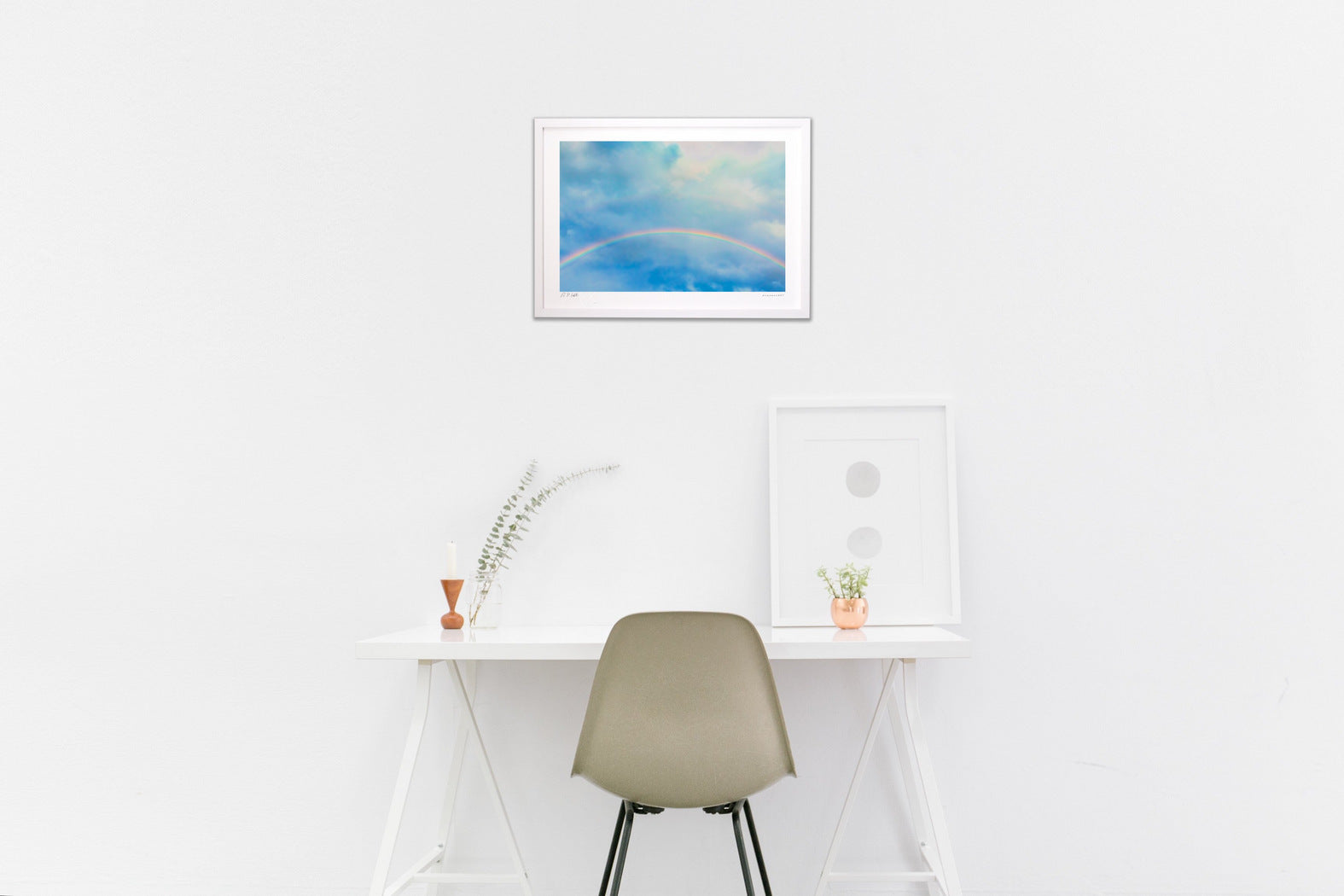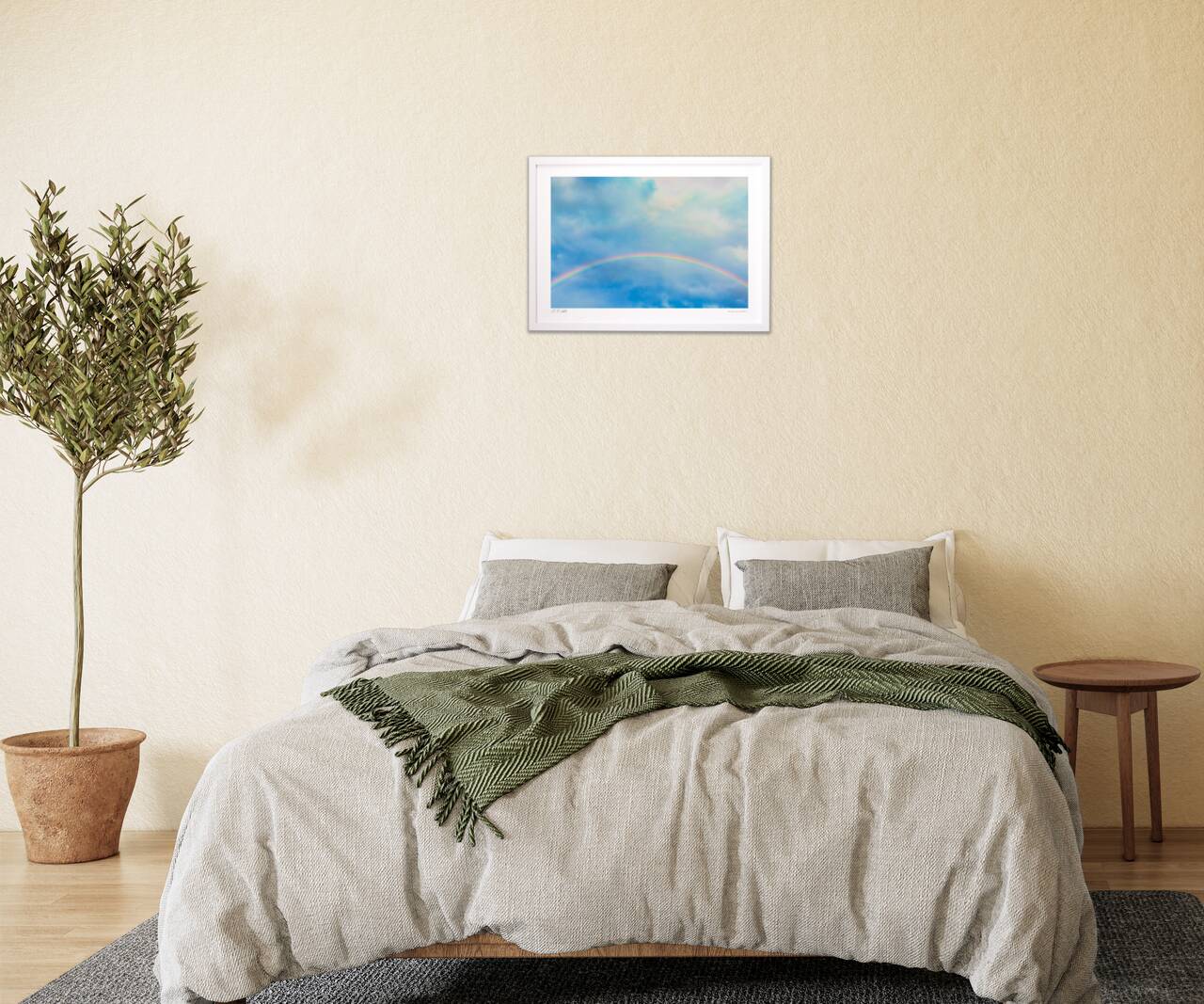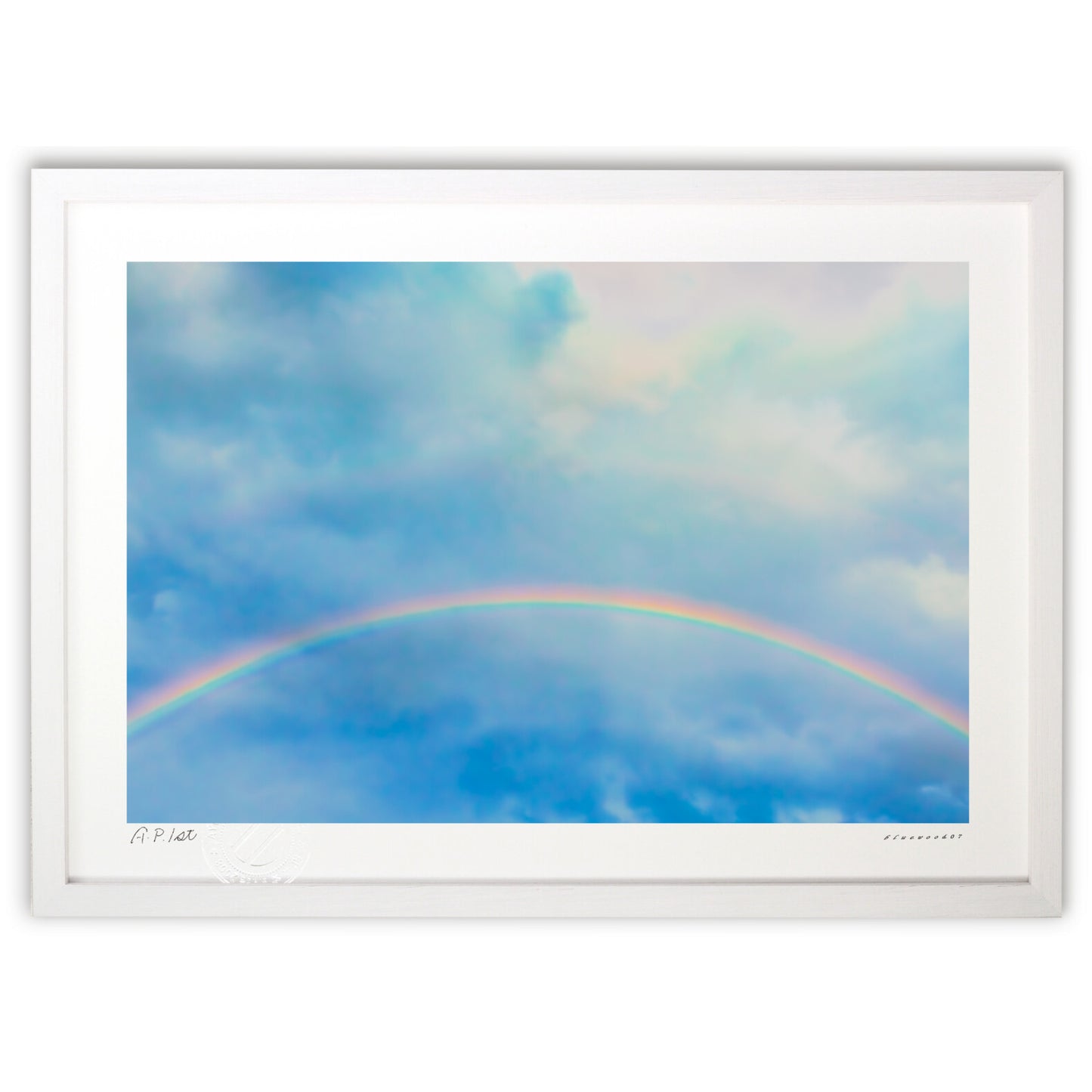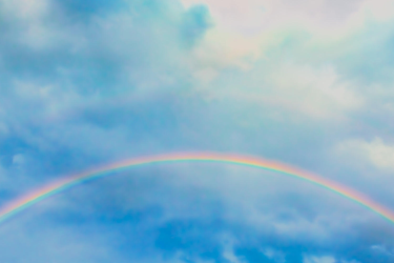 澄んだ青空の中に、ふわふわの白い雲が浮かび、しっとりとした色合いの虹がかかった姿は、まるで大自然が「希望」を送ってくれたかのようでした。