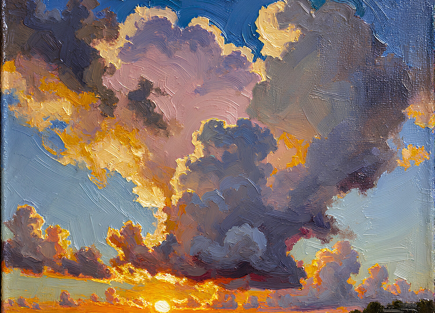 空は夕焼けで、大きな積乱雲の一部が暗い。