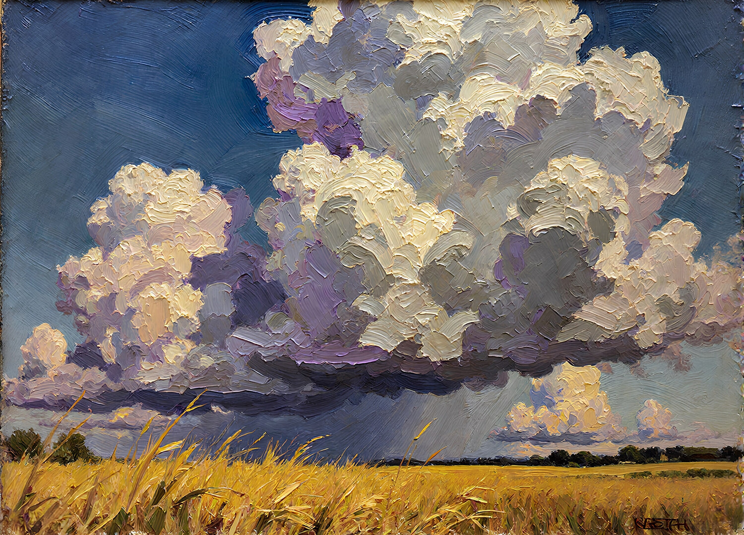 深い青空にそびえ立つ巨大な積雲が、重厚で立体的な厚塗りの筆致で描かれている。