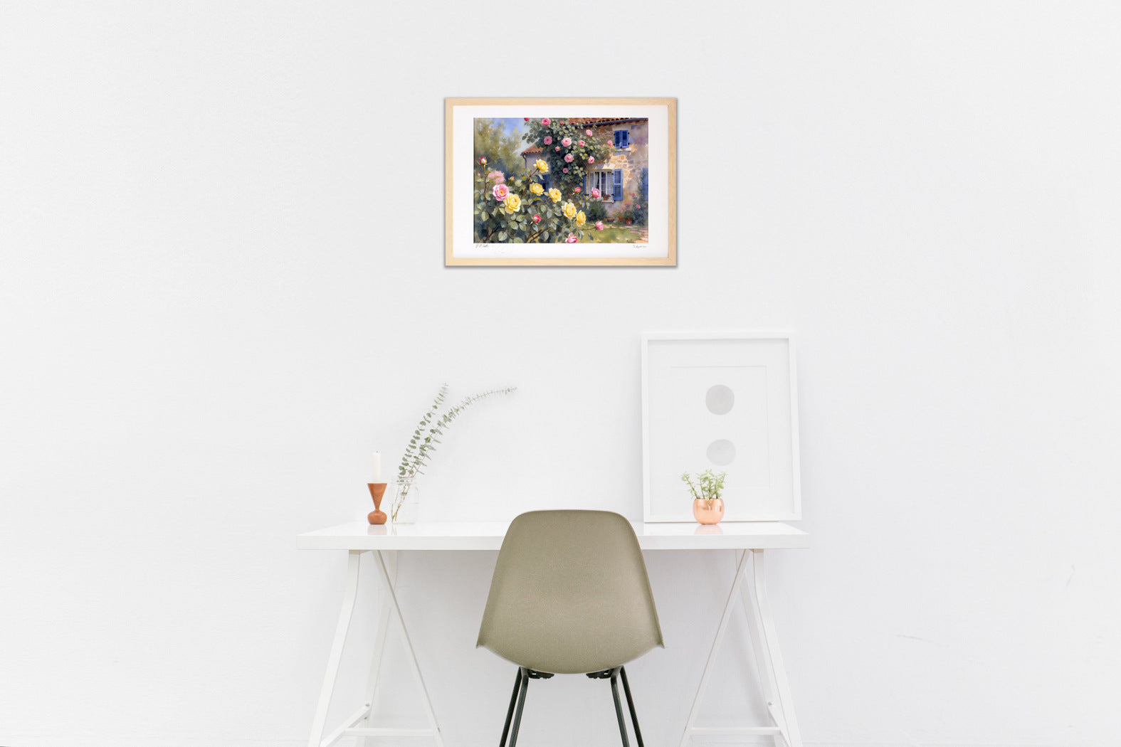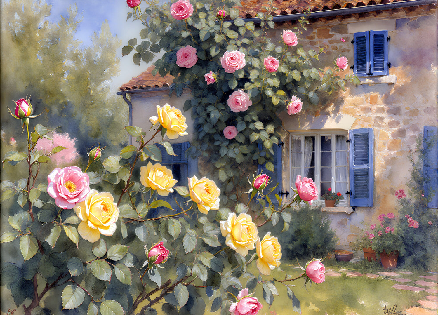 南欧の春。庭には木立性のバラとつるバラが咲いています。
