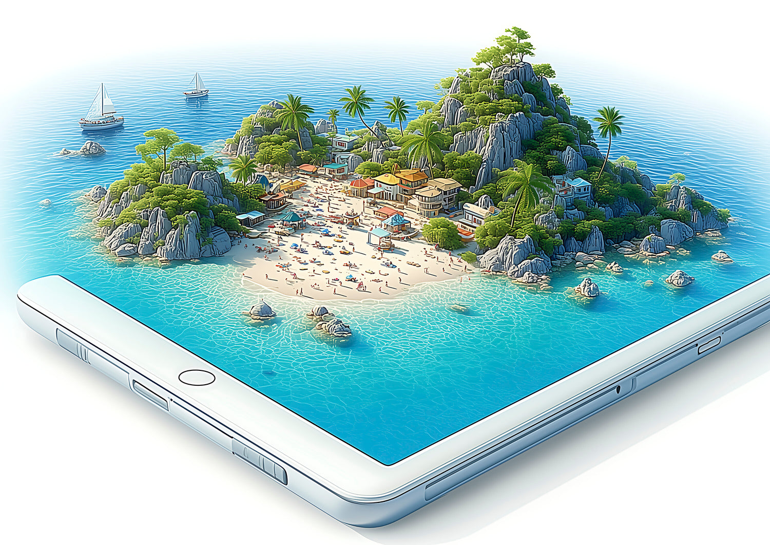 タブレットに映る島の風景は、遠い南国の景色でありながら、手のひらの距離にあります。