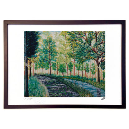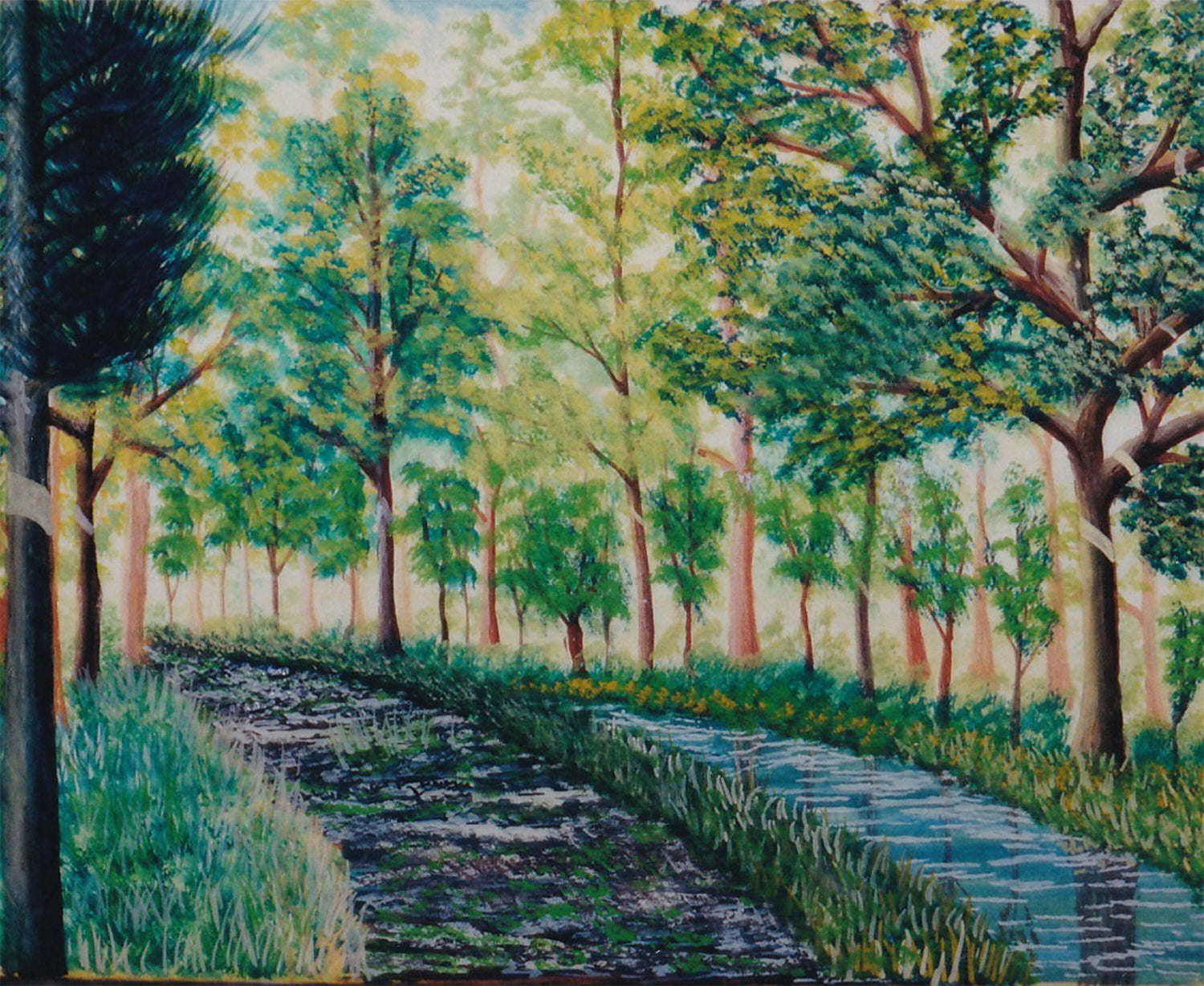 これは昔、どこかの遊歩道を歩いていた時の事を思い出し、半分はそれを基に川も入れ、木漏れ日が射す暖かい雰囲気の絵を今から20年以上前に描いてみました。