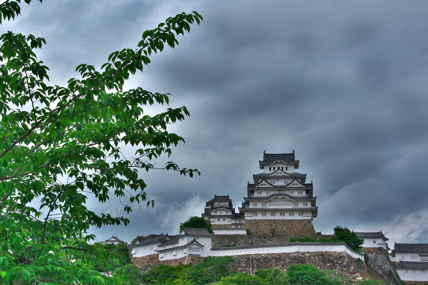 初夏の新緑と曇天が織りなす姫路城の静謐な美
