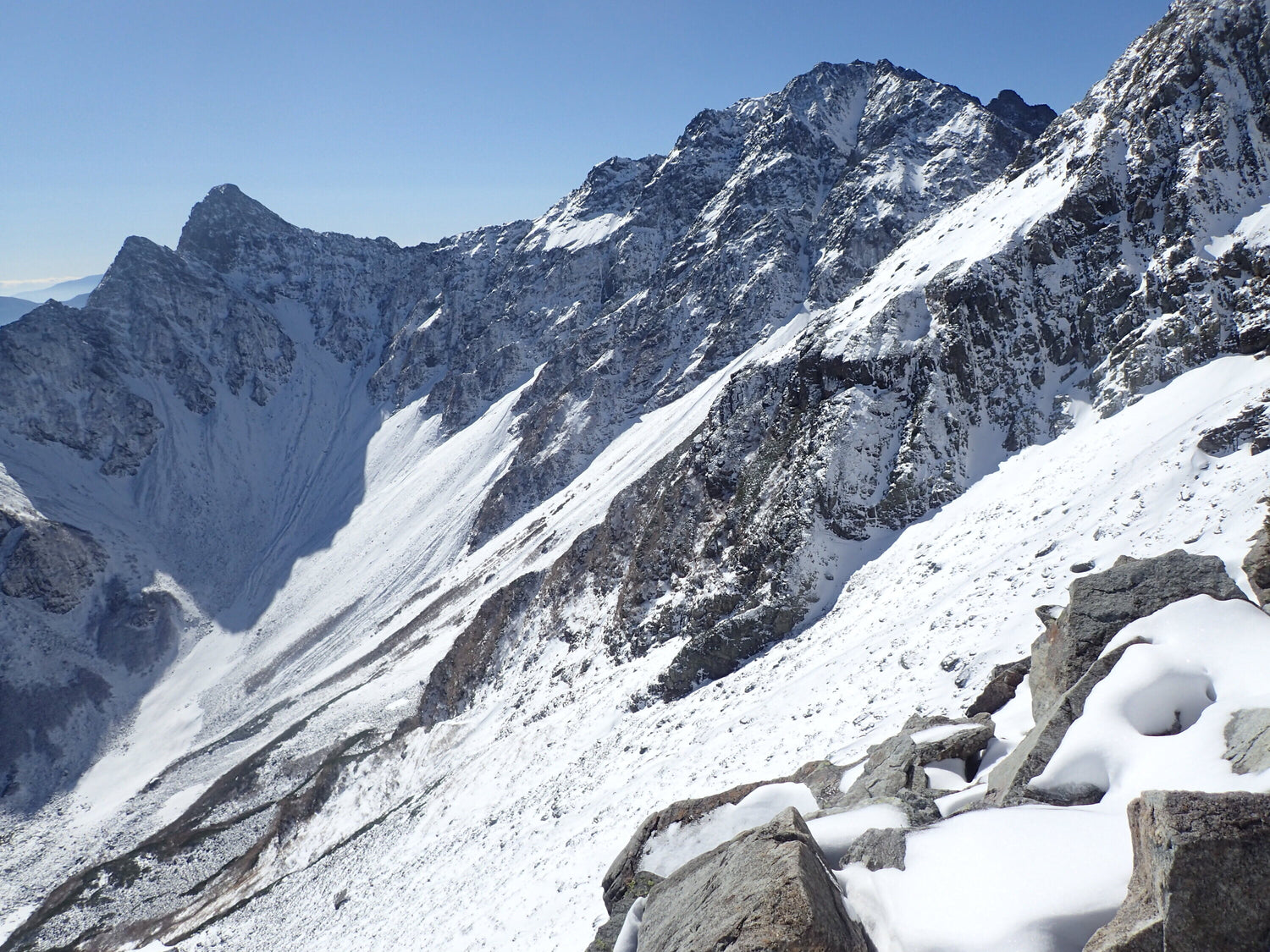 新雪に輝く奥穂高、前ほだか釣り尾根