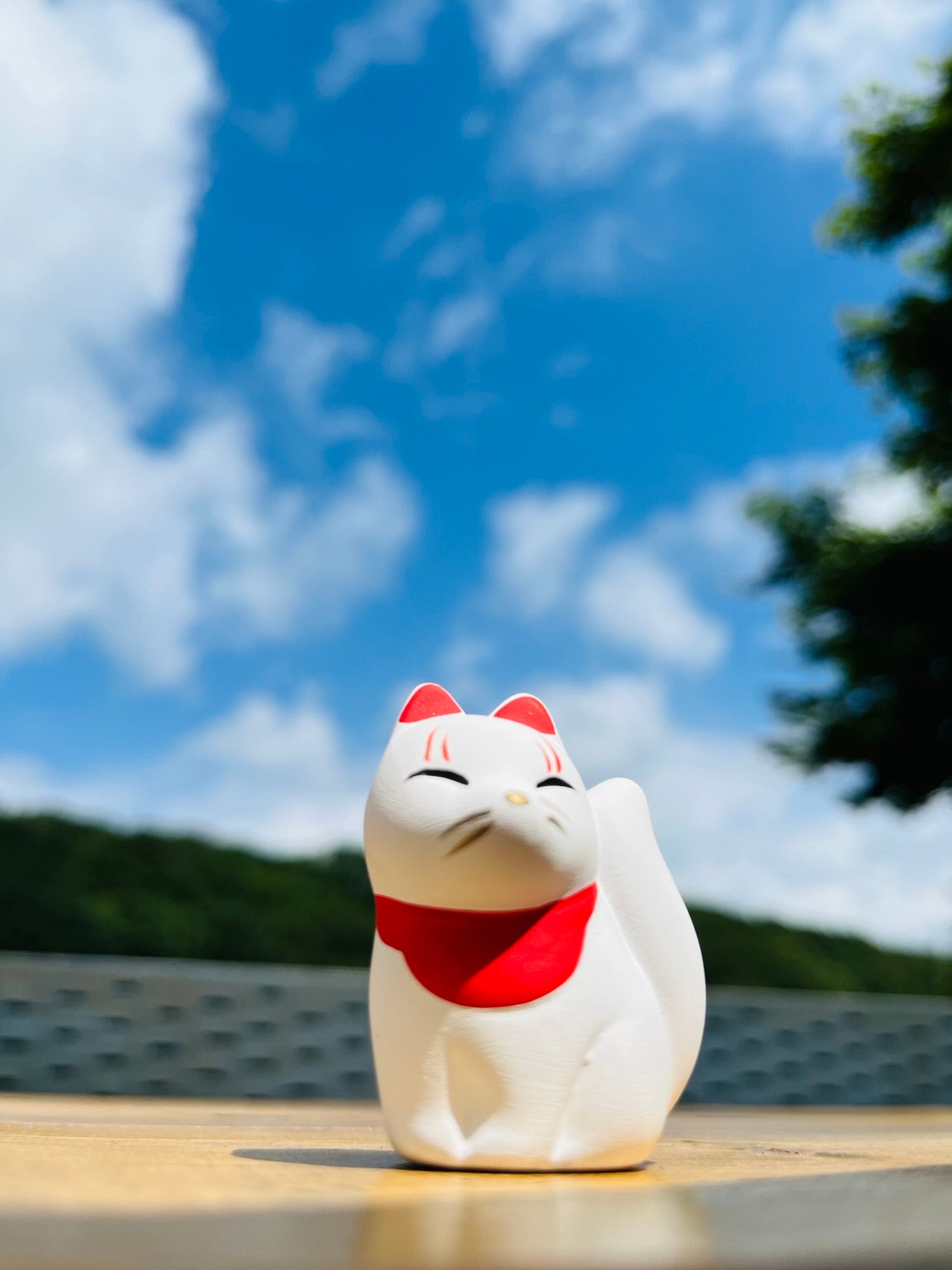 家族旅行先で見つけたキツネの置物を青空を背景に置いてみたら良い感じになりました。