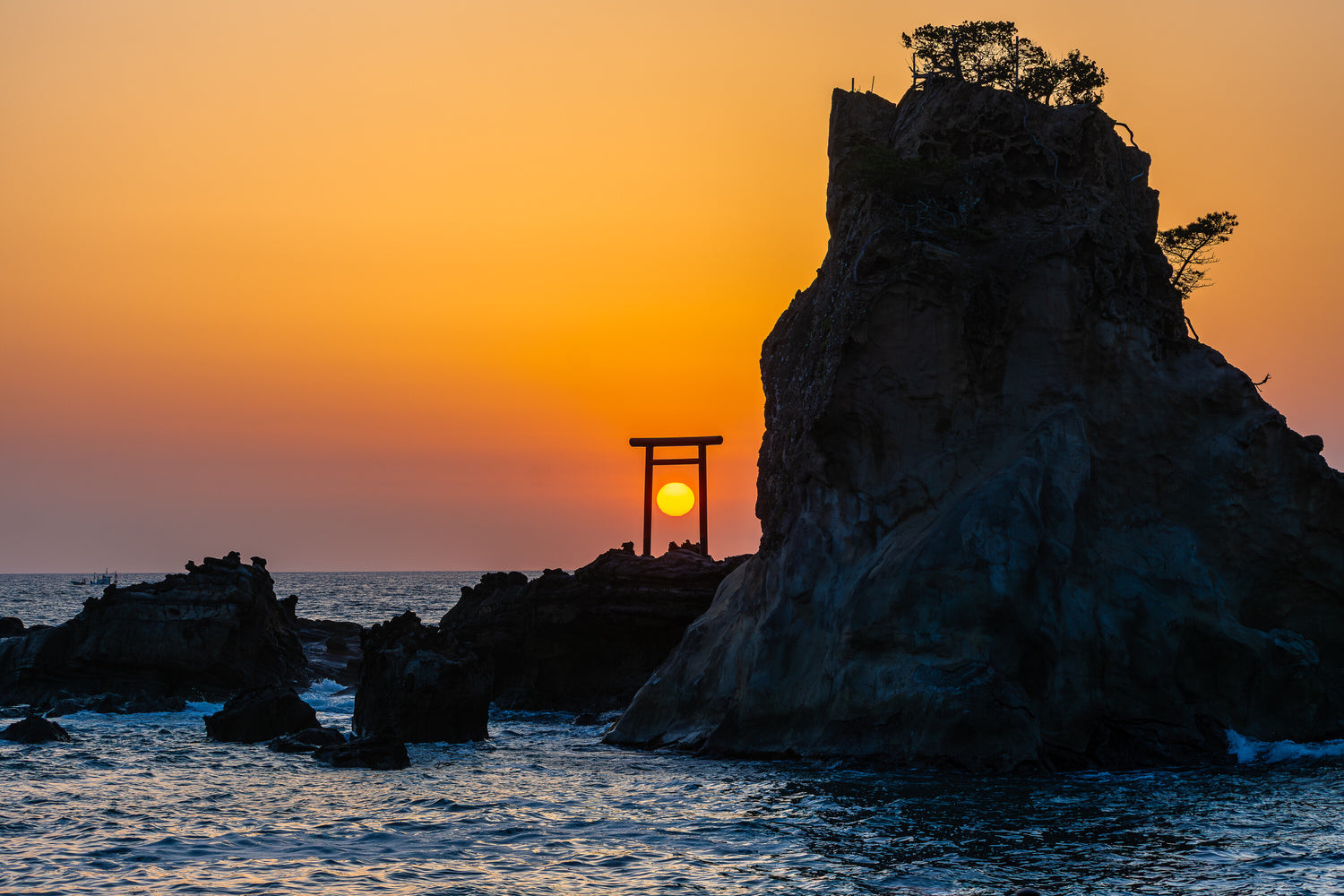波立海岸弁天島の鳥居に昇る朝日