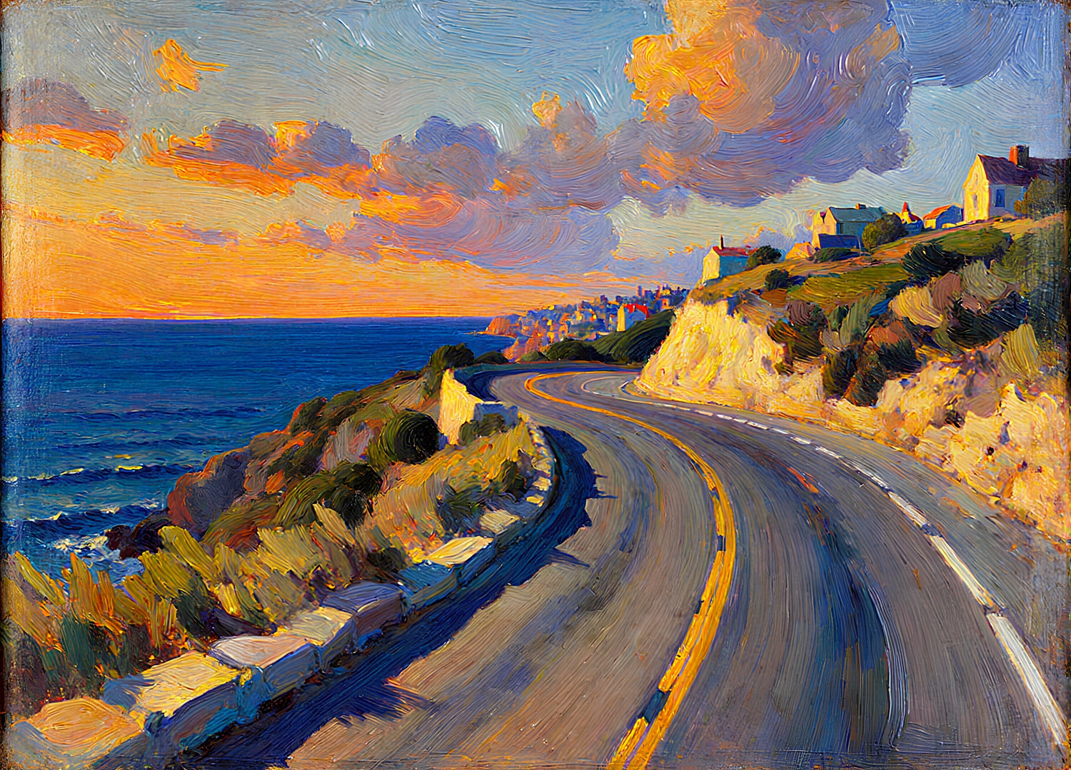 日没前の海へ続く下り坂の道