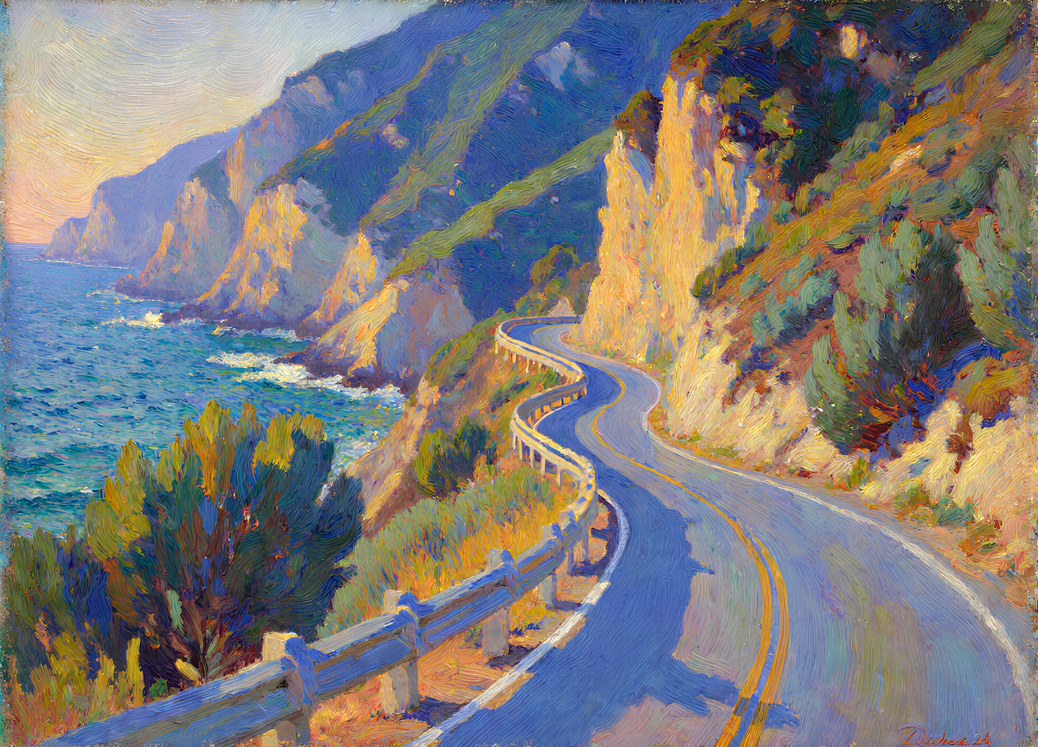 日没時の曲がりくねった海岸沿いの山道