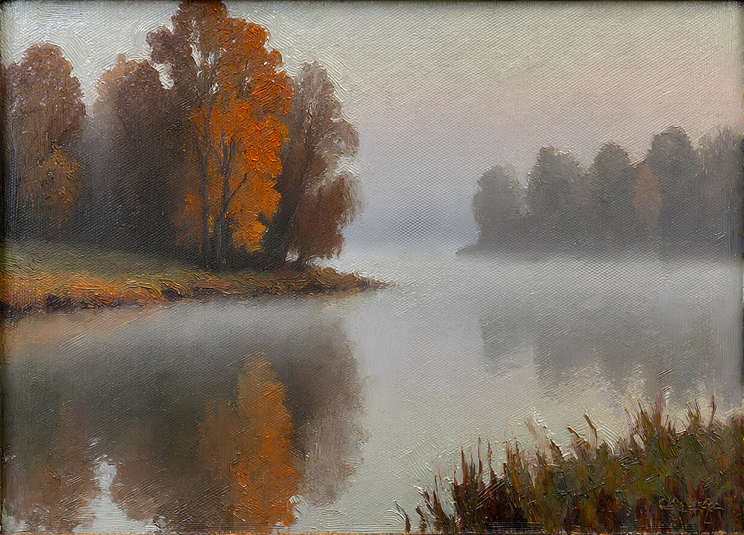 柔らかな灰色の空に溶け込む静かな水面