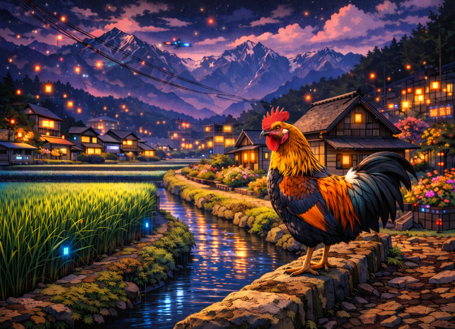 星明かりに包まれた里山の夜。田んぼの緑と水路の流れが静かに続き、古民家の灯りが点々と村をあたためます。舞う光の粒は、ほたるのようでもあり、どこか近未来のサインのようでもある——そんな“懐かしさと新しさの同居”を描きました。手前に佇む雄鶏は、この景色の見張り番。水面に揺れる光を見つめながら、夜の静けさを凛と整えています。飾るほどに心が落ち着き、深呼吸したくなる一枚です。