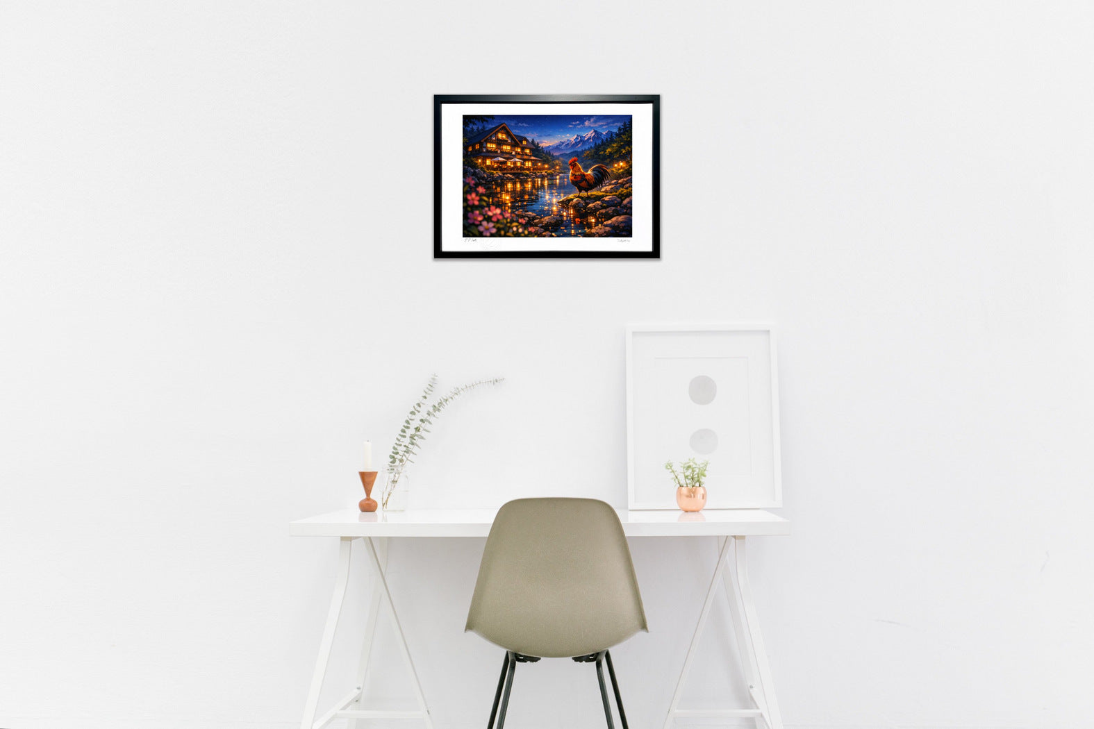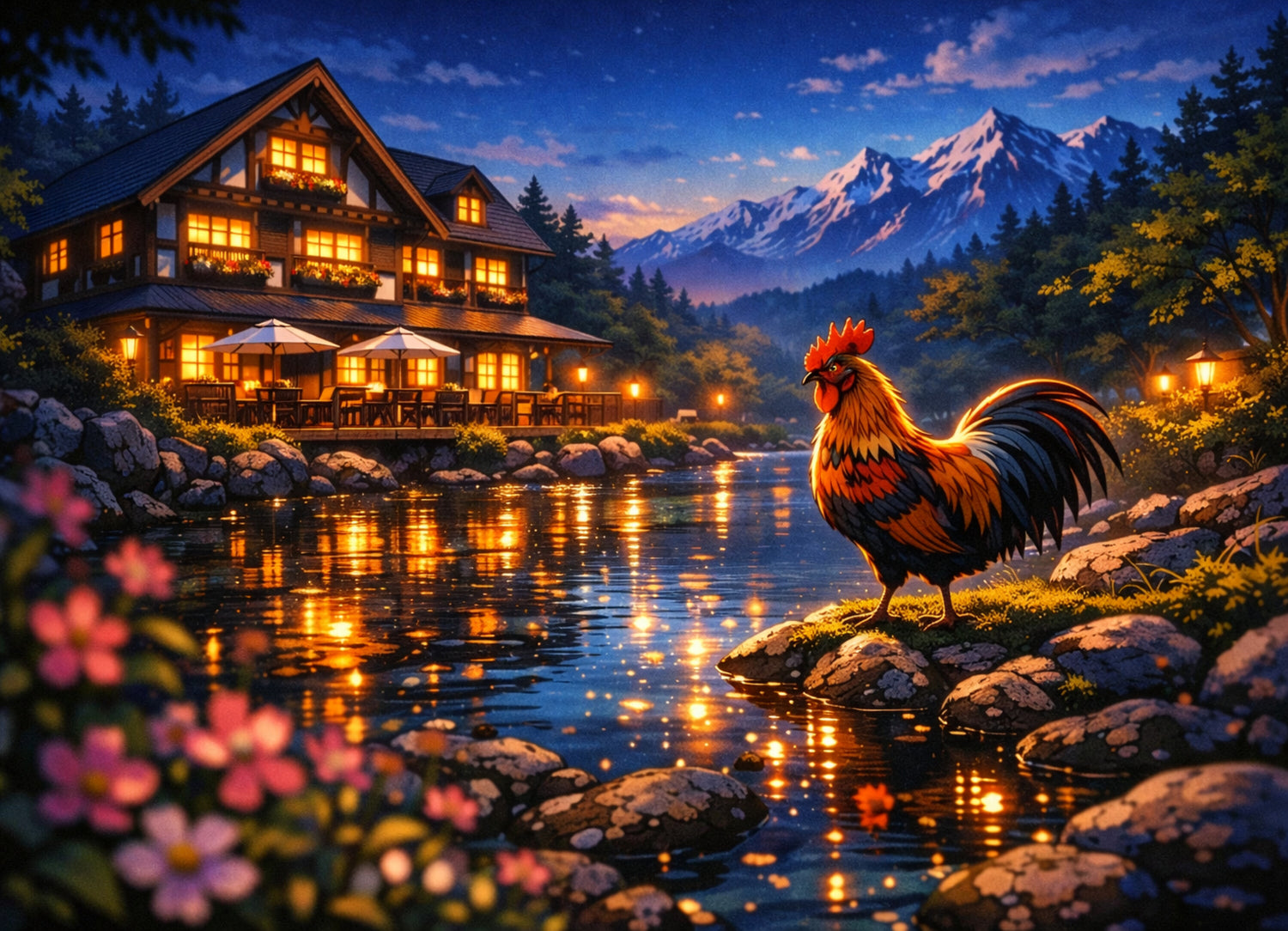 深い青に染まるブルーアワーの高原。リバーサイドロッジの温かな灯りが川面に揺らめき、静かな夜の始まりを告げる。手前の花の柔らかなボケが奥行きを生み、雪を抱いた山々が物語の舞台を支える中、岩の上に立つ雄鶏が誇り高く景色を見守る。光と水、静寂のコントラストが美しい、旅情あふれるシネマティックな情景作品。