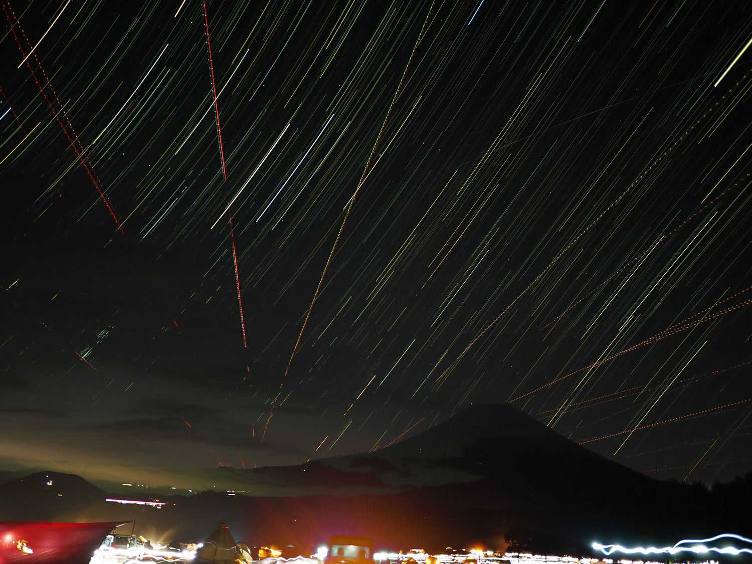 富士山に初雪が降った日、夜間の天気が良い日をずっとまっていまいた。キャンプしながら三脚を立てて、富士山とその上空をうつしました。星と、西や東に飛ぶ飛行機の軌跡がうつりました。