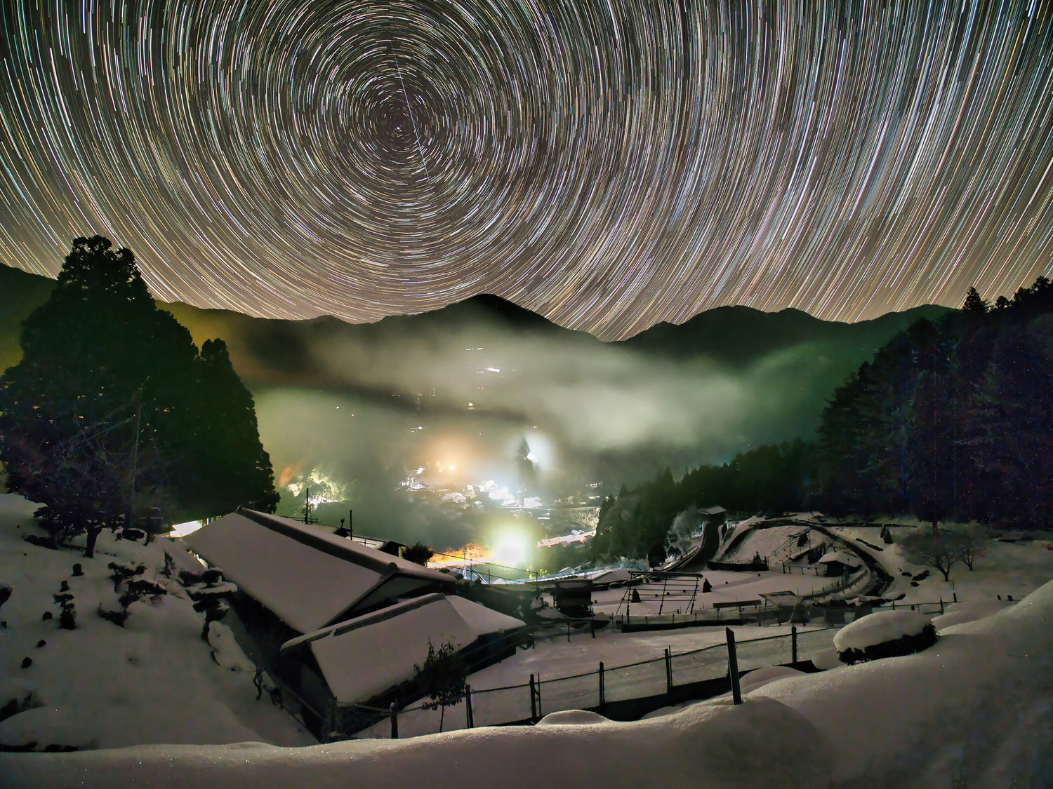 雪景色に浮かぶ静かな落合集落に星空が舞う。この日は、コロナ禍で飛行機が飛ばず、しかも北極星の近くに流れ星が流れ、最高の景色でした。