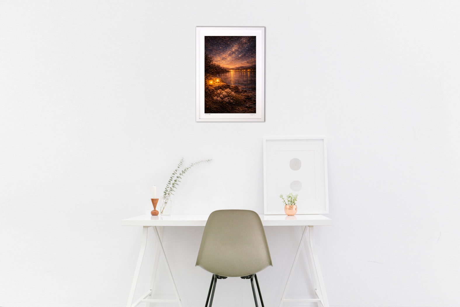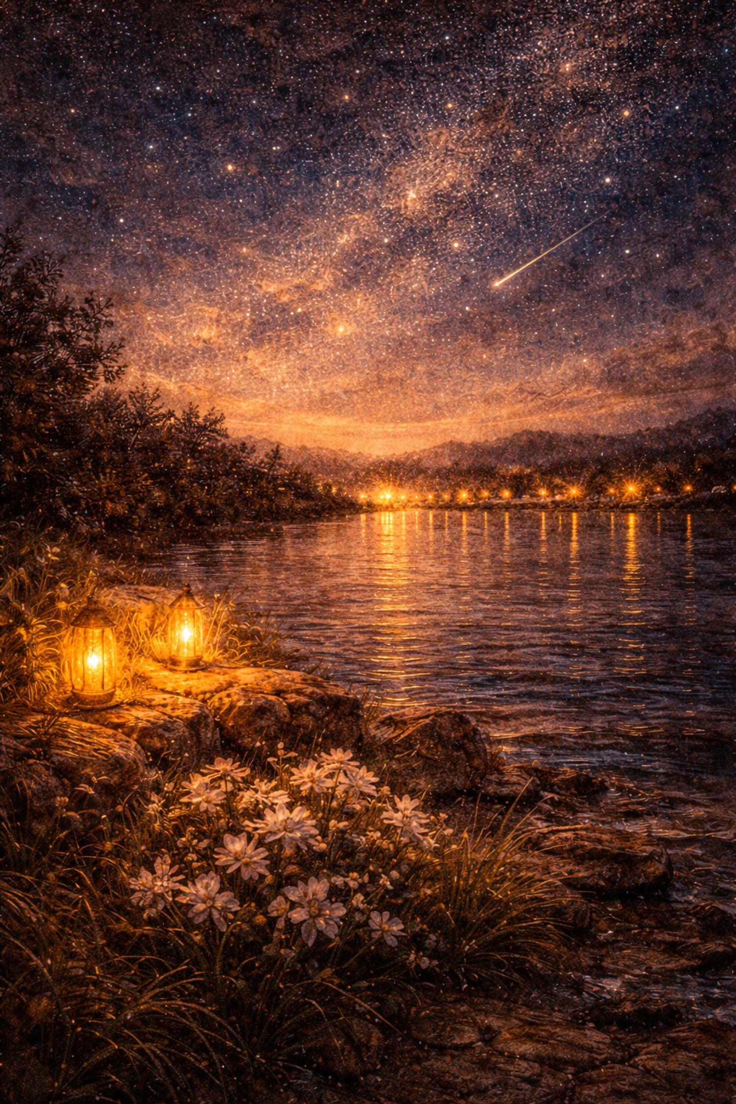 湖畔に灯る小さなランタンの光が、広大な宇宙と人の営みをやさしく結びつけています。