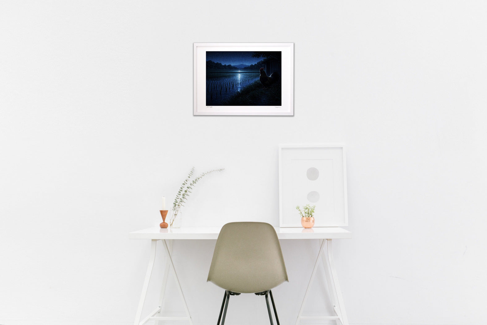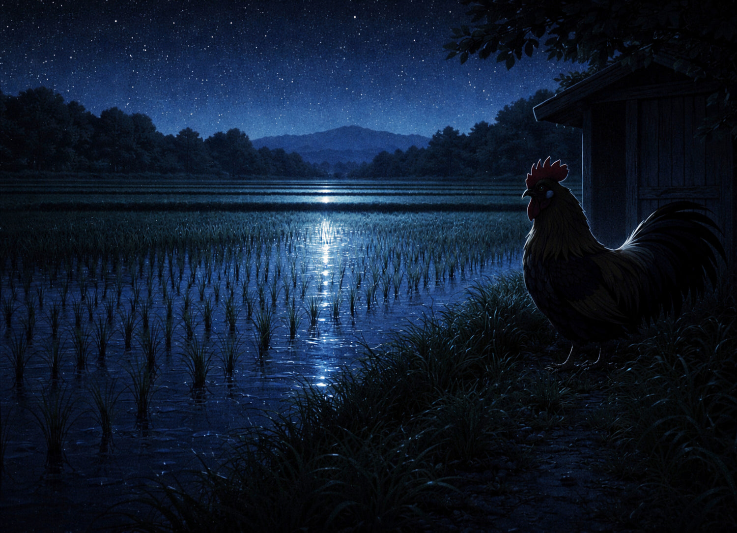 星が瞬く夜の田んぼに、月光が一直線の“光の道”を落とす静謐な情景。畦に佇む雄鶏のシルエットと、暗がりの小屋が奥行きと物語性を添え、田園の夜の静けさをシネマティックに切り取った一枚です。