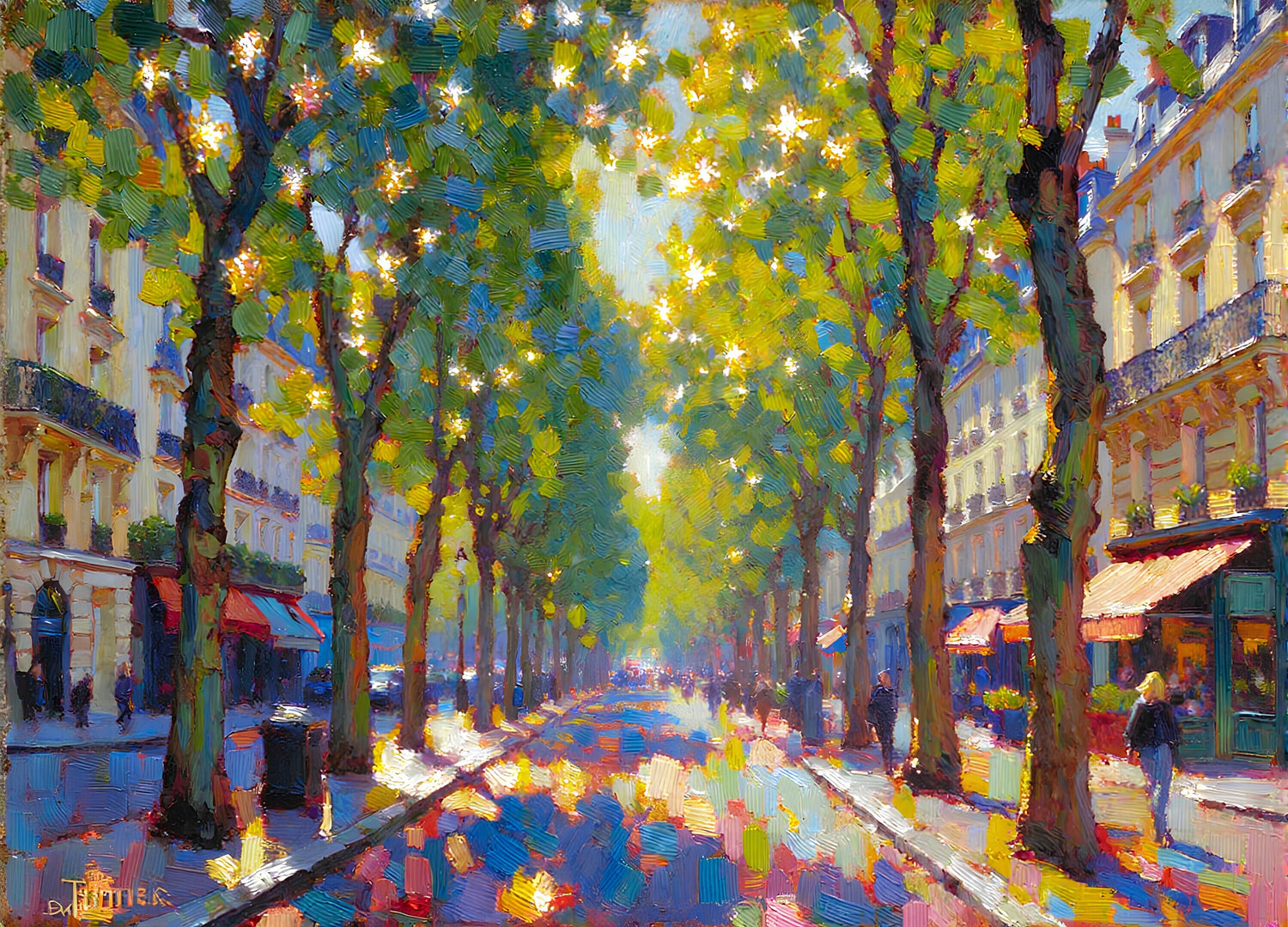 通り沿いの背の高い木々の間から差し込む強烈な木漏れ日が、歩道に明るい光の揺らめきと色とりどりの影を描き出している。