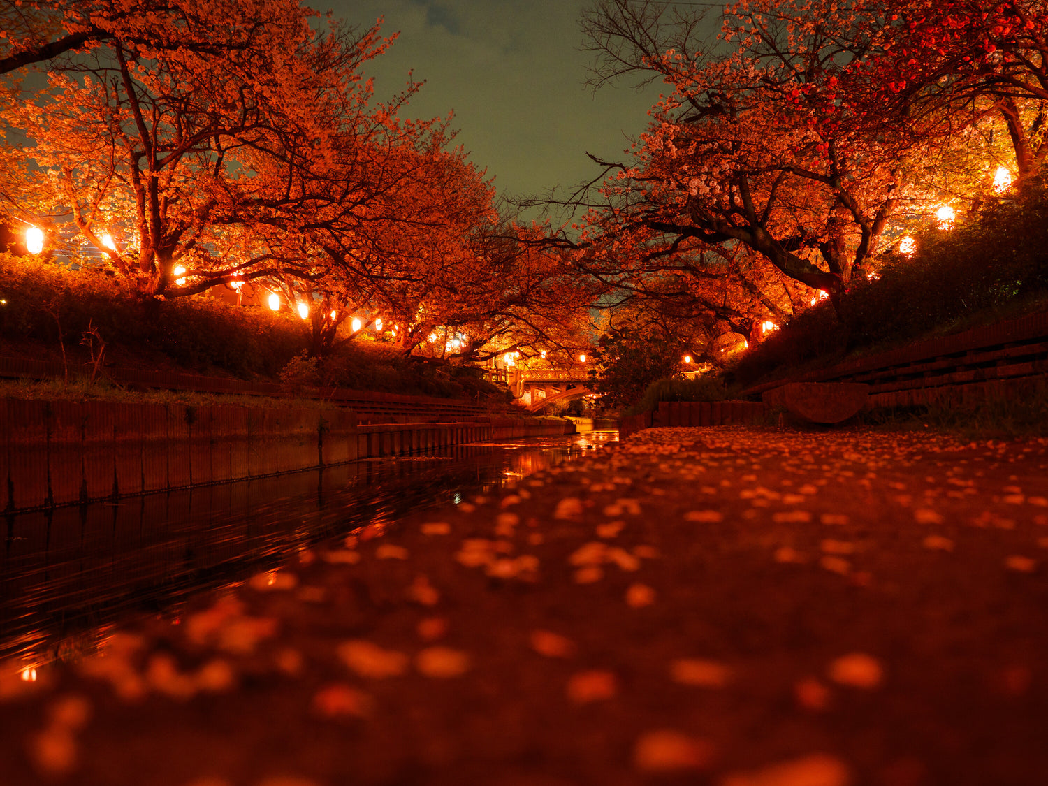 ライトアップされた桜堤、桜が散り始めて春の終わりを告げるような儚さが素敵だったので写真に収めました。
