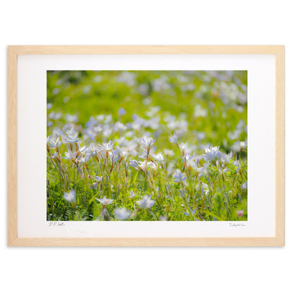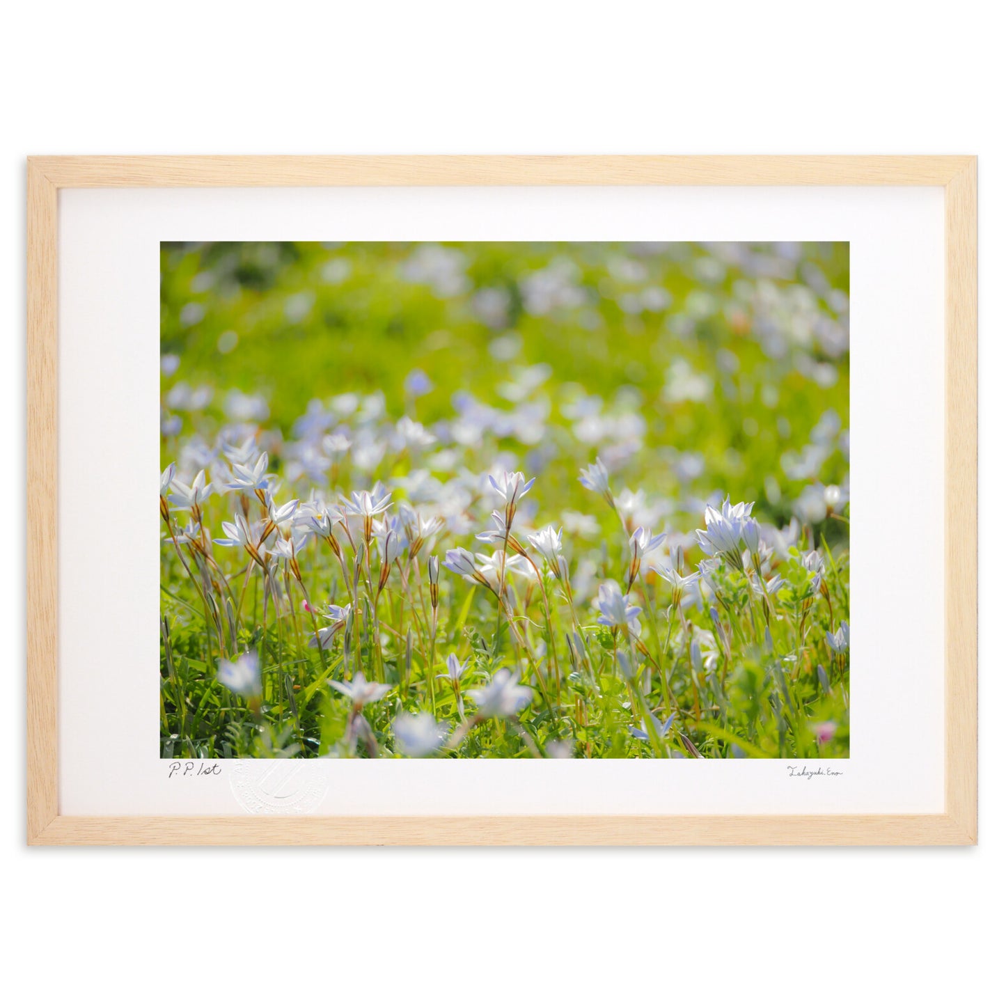 あゆわらの企画・制作・販売の作品。 画用紙のような質感の高級アート紙を採用。 発色が豊かなので繊細な色を忠実に再現。 印画紙ではないので、絵なのか写真なのか迷う不思議な印象です。 紙に光沢がなく、光を反射しないので、 蛍光灯の光で作品が見えづらくなることもありません。 色の再現性もこだわりました。 色調整は、最新技術で厳密に行うことが出来ます。正確に色を再現できるデジタル印刷で一枚一枚制作。 品質をチェックし、合格したものにあゆわらのエンボス印を入れて完成となります。