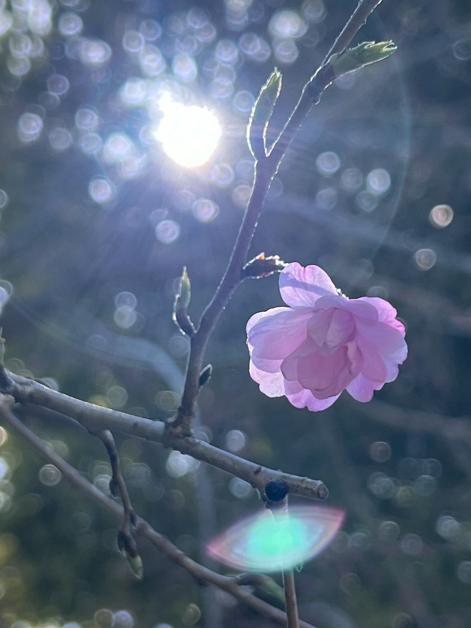 太陽の光に照らされる、咲いたばかりの一輪の桜が、春の訪れを告げる。