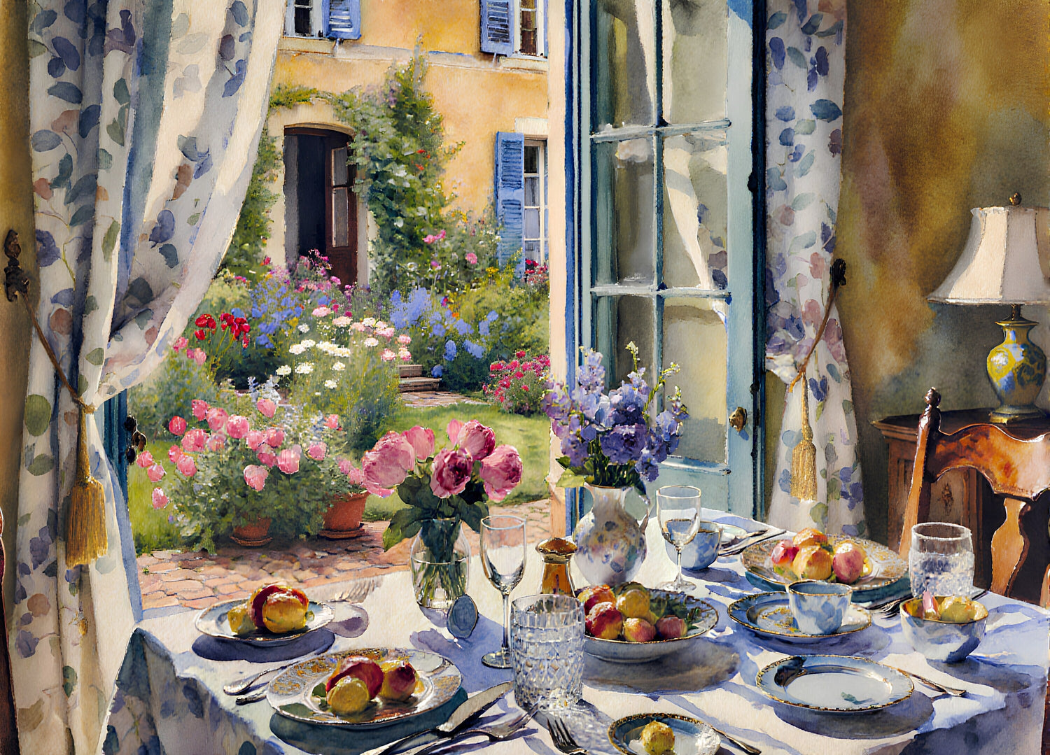 南欧の春。中庭に面した窓を開けて食卓を囲みます。