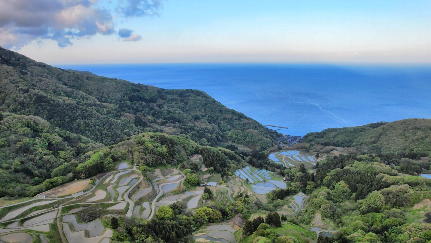 水を張った棚田がやわらかな春光を映し、遠く日本海へと続く開放的な景色が広がります。