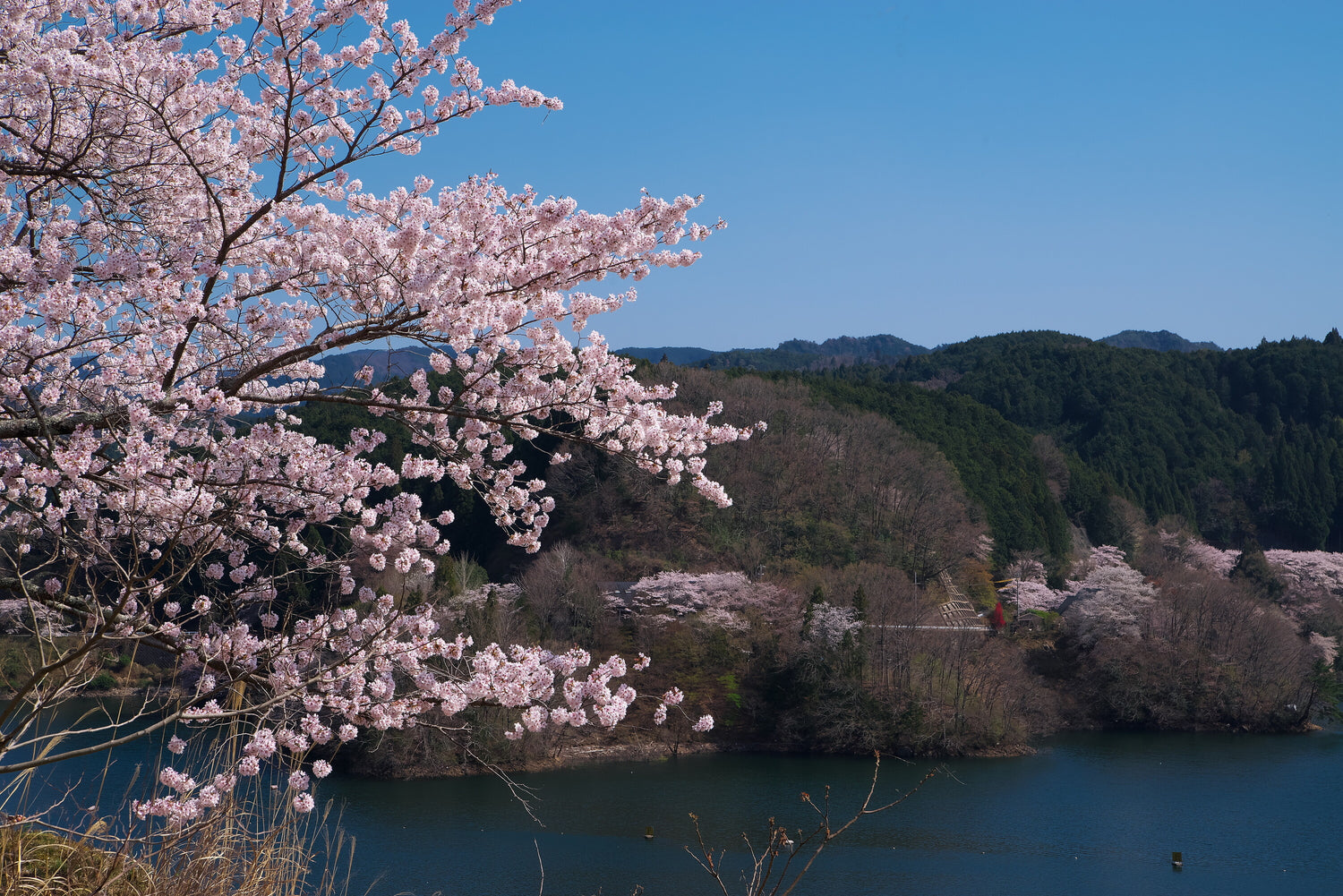 この写真は、名張市の青蓮寺ダム湖を見下ろす展望台から撮影されたもので、春の澄み切った青空と満開の桜が見事に調和しています。湖の奥に広がる山々と、桜が点在する風景は、日本の原風景を想わせる静かな美しさをたたえています。手前の桜の枝が画面にリズムを与え、まるで観る者を春の物語へと誘うかのようです。