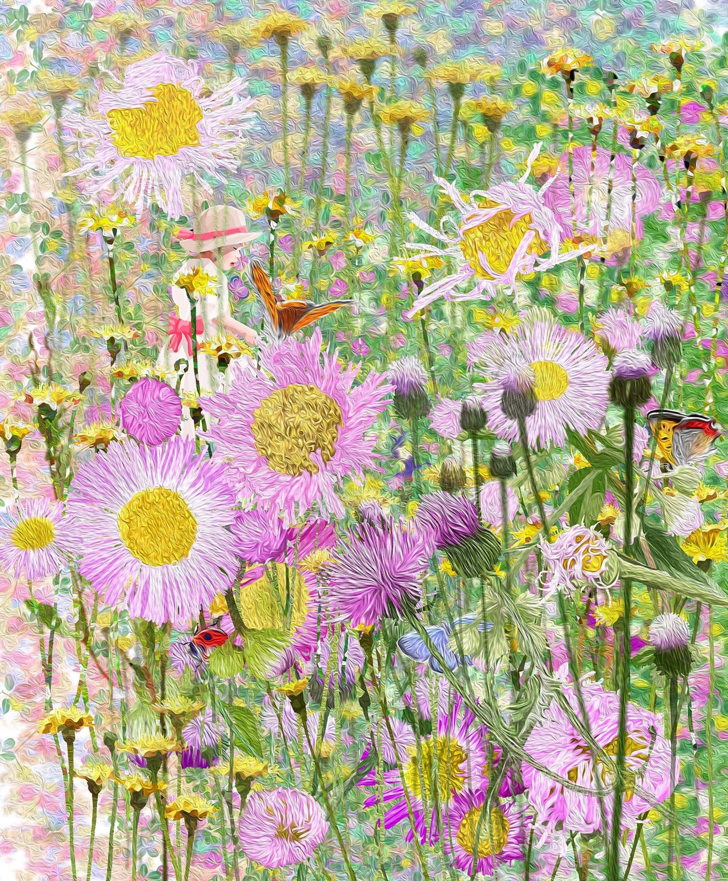 柔らかな春の光の中で、野の花や蝶と遊ぶ少女
