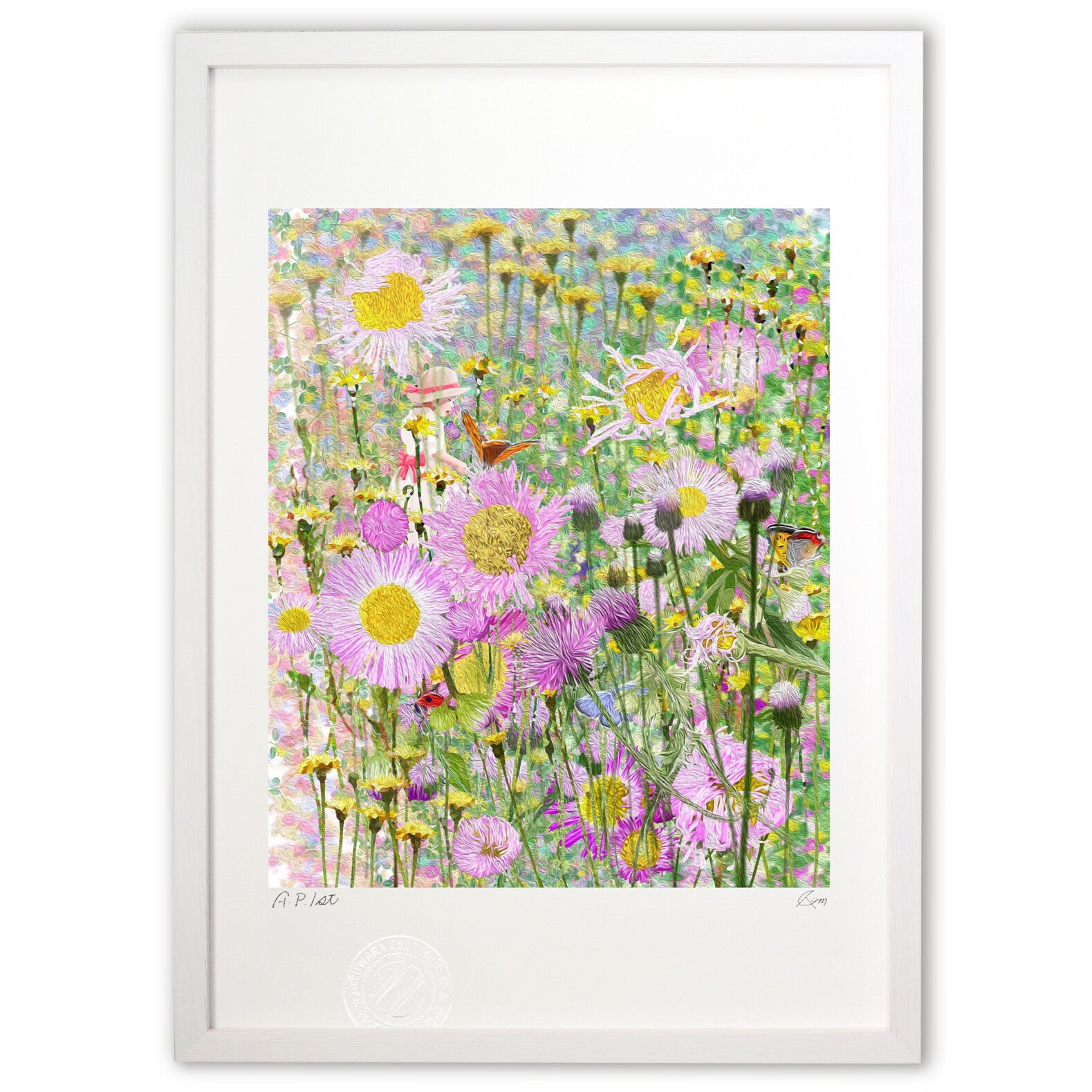 あゆわらの企画・制作・販売の作品。 画用紙のような質感の高級アート紙を採用。 発色が豊かなので繊細な色を忠実に再現。 印画紙ではないので、絵なのか写真なのか迷う不思議な印象です。 紙に光沢がなく、光を反射しないので、 蛍光灯の光で作品が見えづらくなることもありません。 色の再現性もこだわりました。 色調整は、最新技術で厳密に行うことが出来ます。正確に色を再現できるデジタル印刷で一枚一枚制作。 品質をチェックし、合格したものにあゆわらのエンボス印を入れて完成となります。