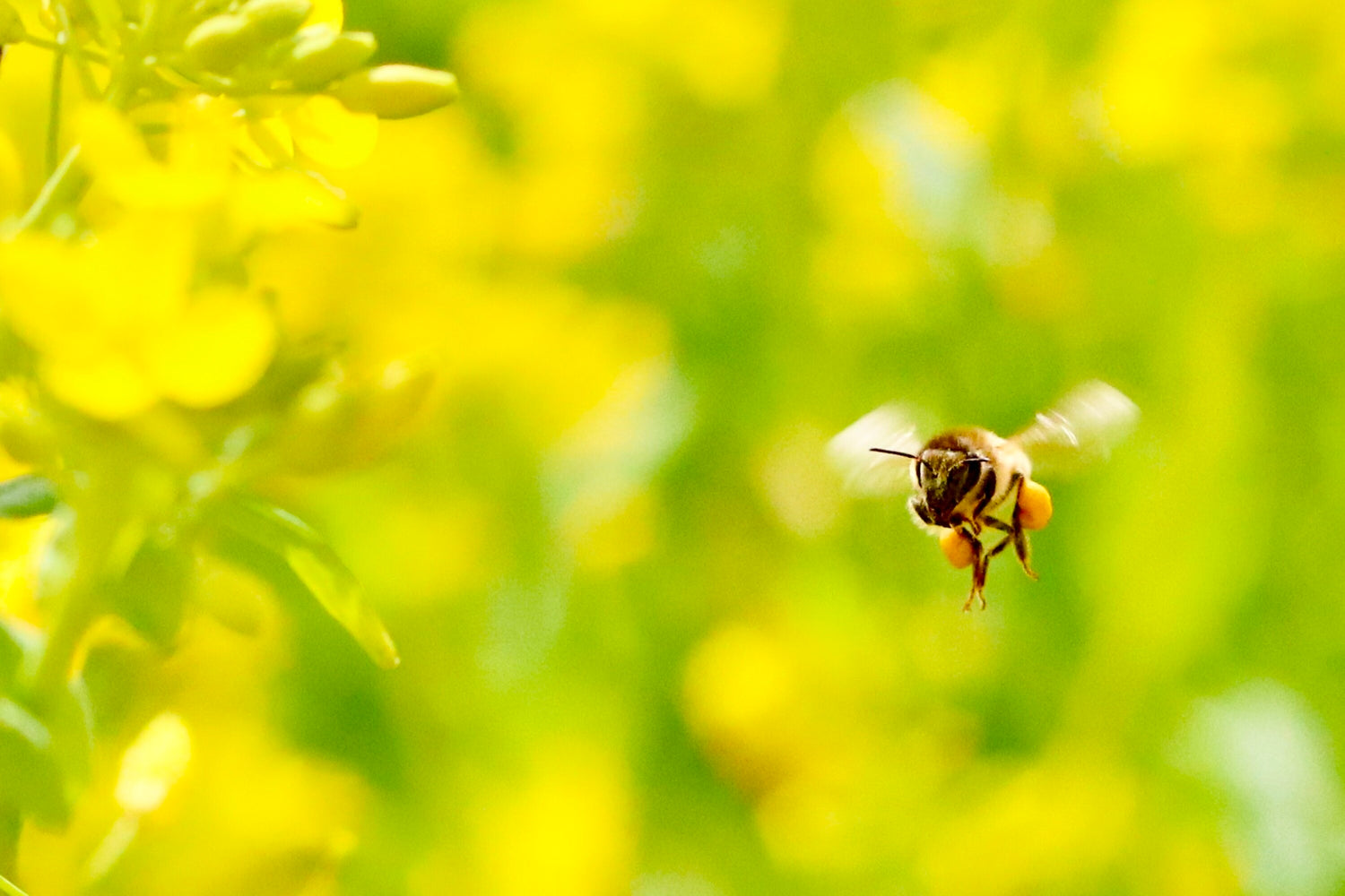 一面の菜の花のなかで一生懸命に蜜を集めるため花から花へと飛び回り「さあ、巣にもどろうか」としているはたらきバチを撮ることができました。