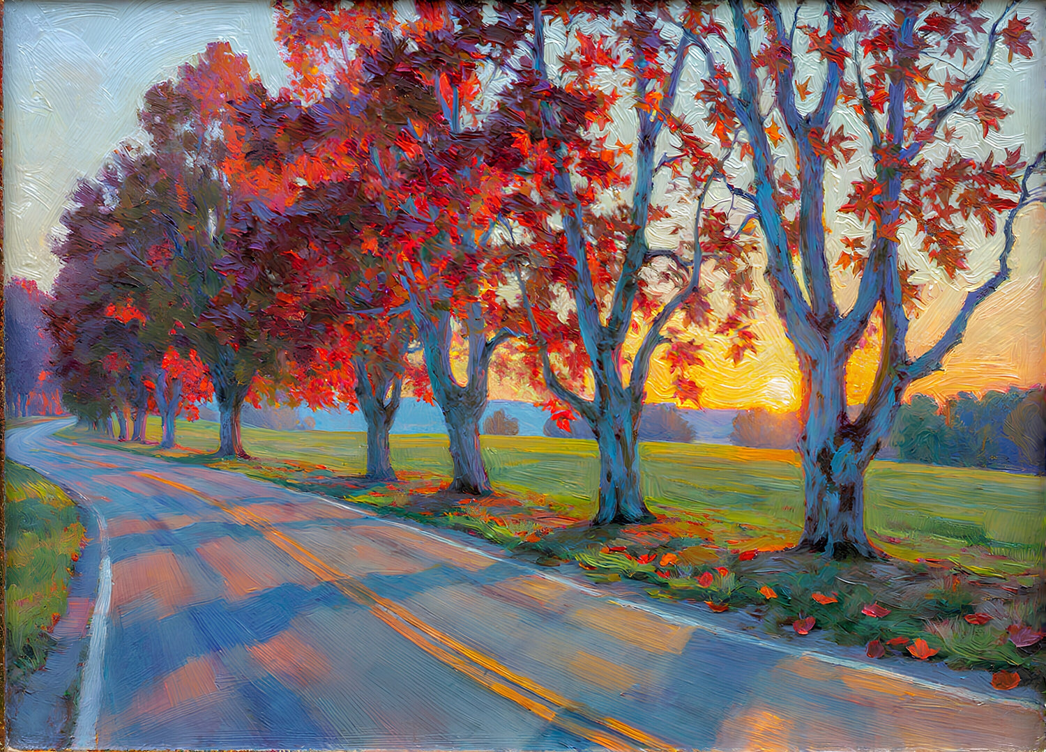 木の葉は朱色と赤に色づき、夕日が当たって輝いている。