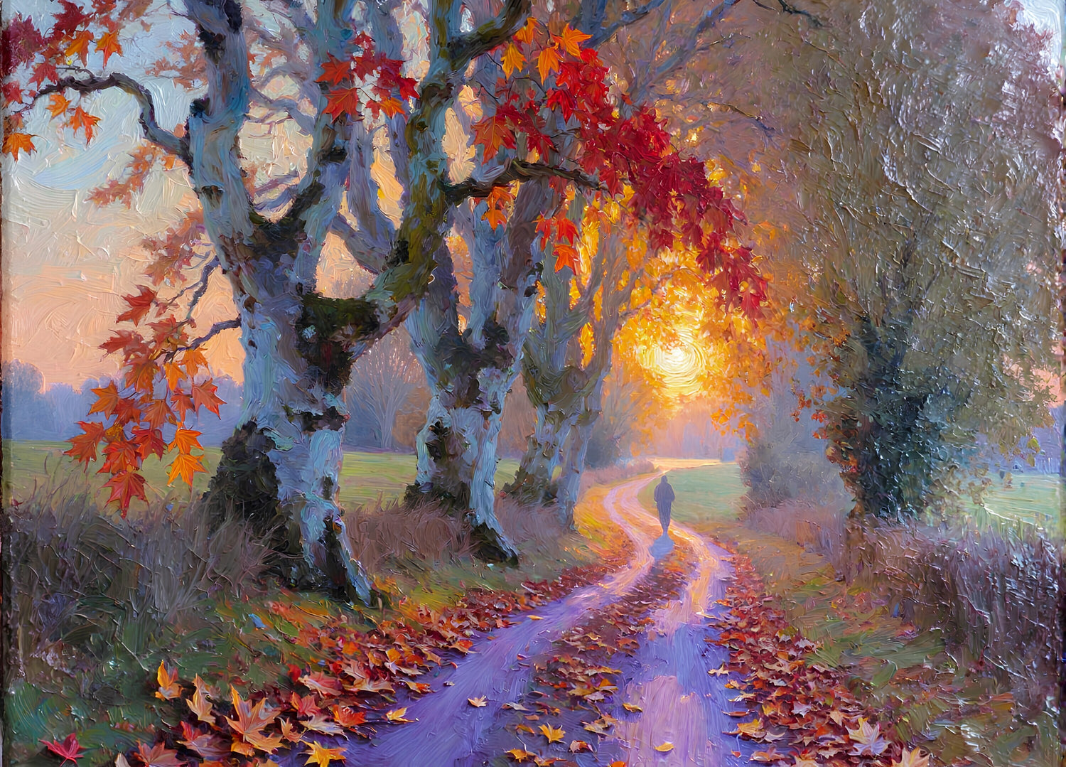 晩秋の夕暮れ、曲がりくねった田舎道を描いた、情感あふれる油絵。