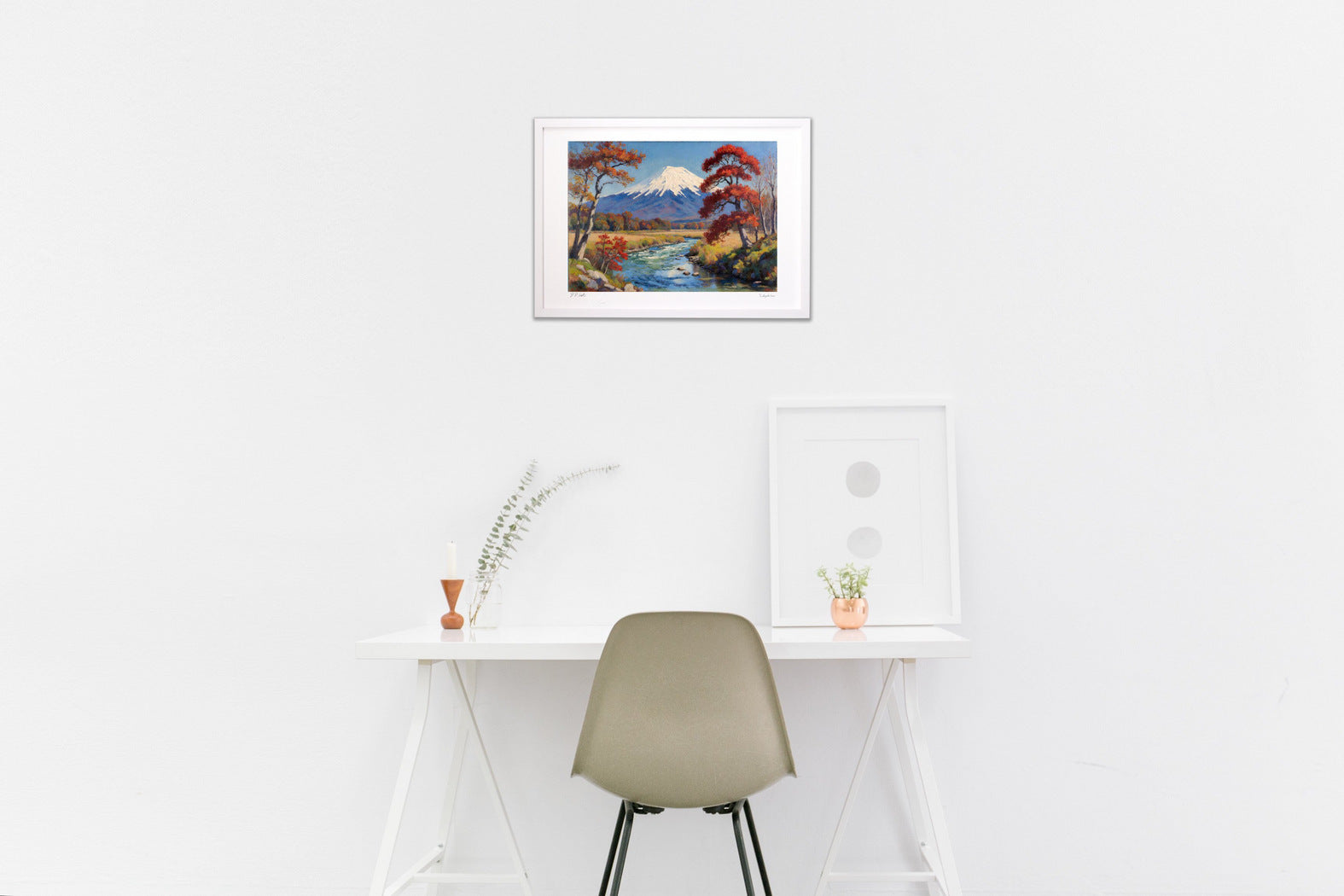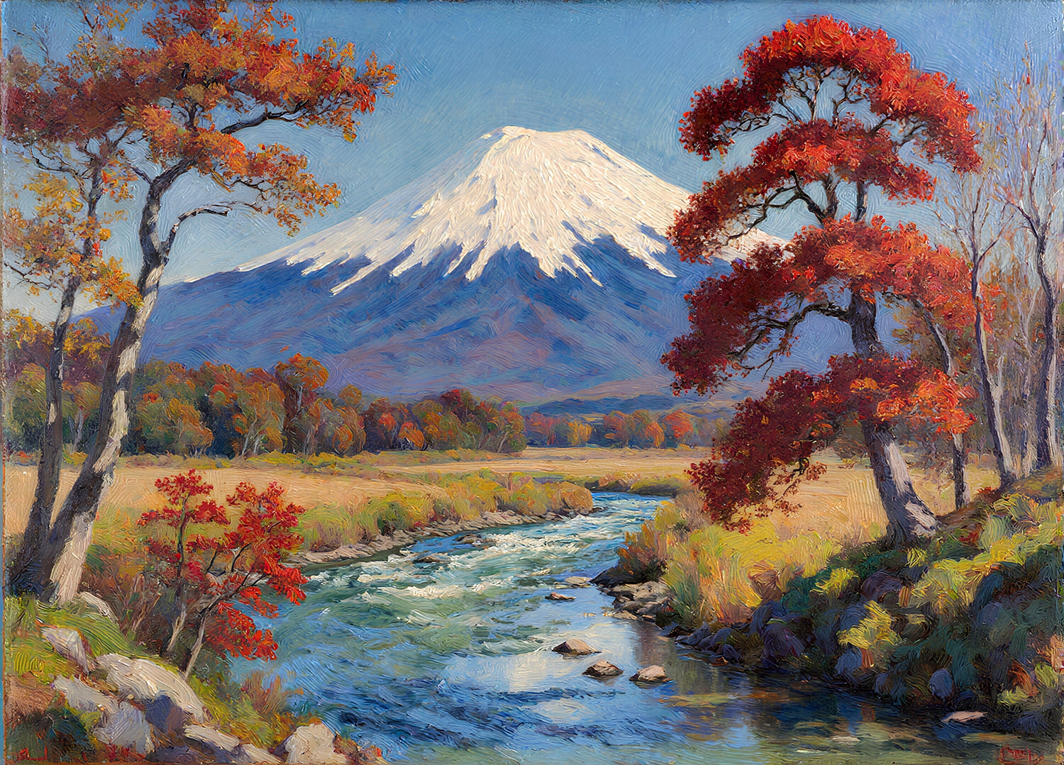 水の澄んだ川が流れ、富士山が冠雪し、近くの木々は色づいている。