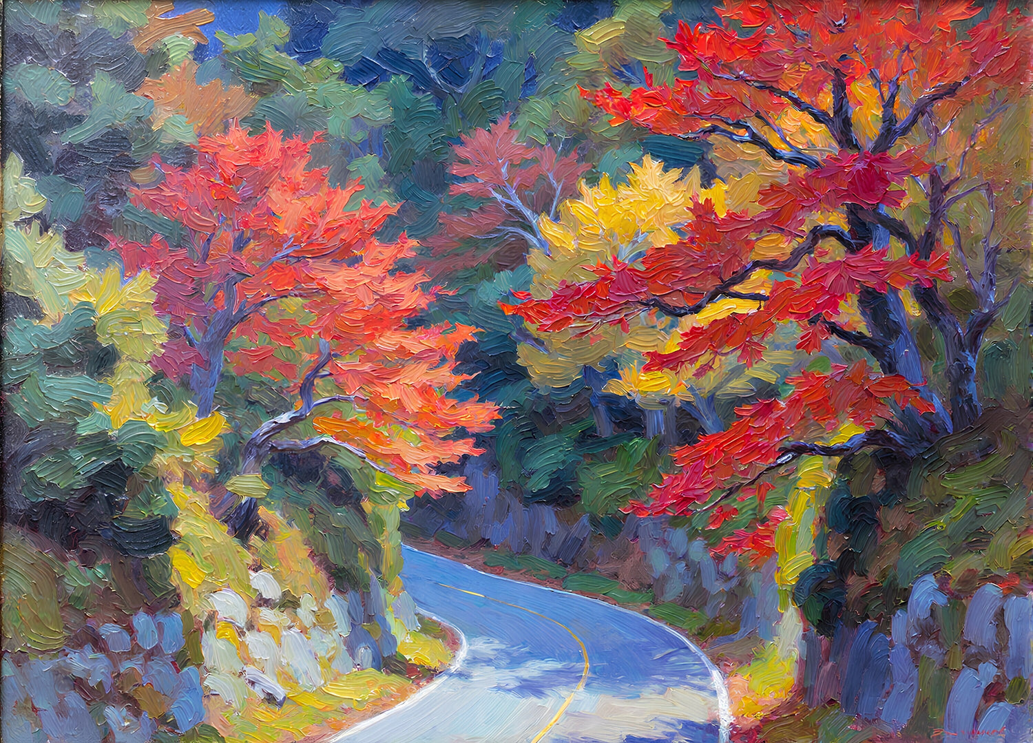 曲がりくねった道路の沿道の木々が赤、朱色、黄色に紅葉している。