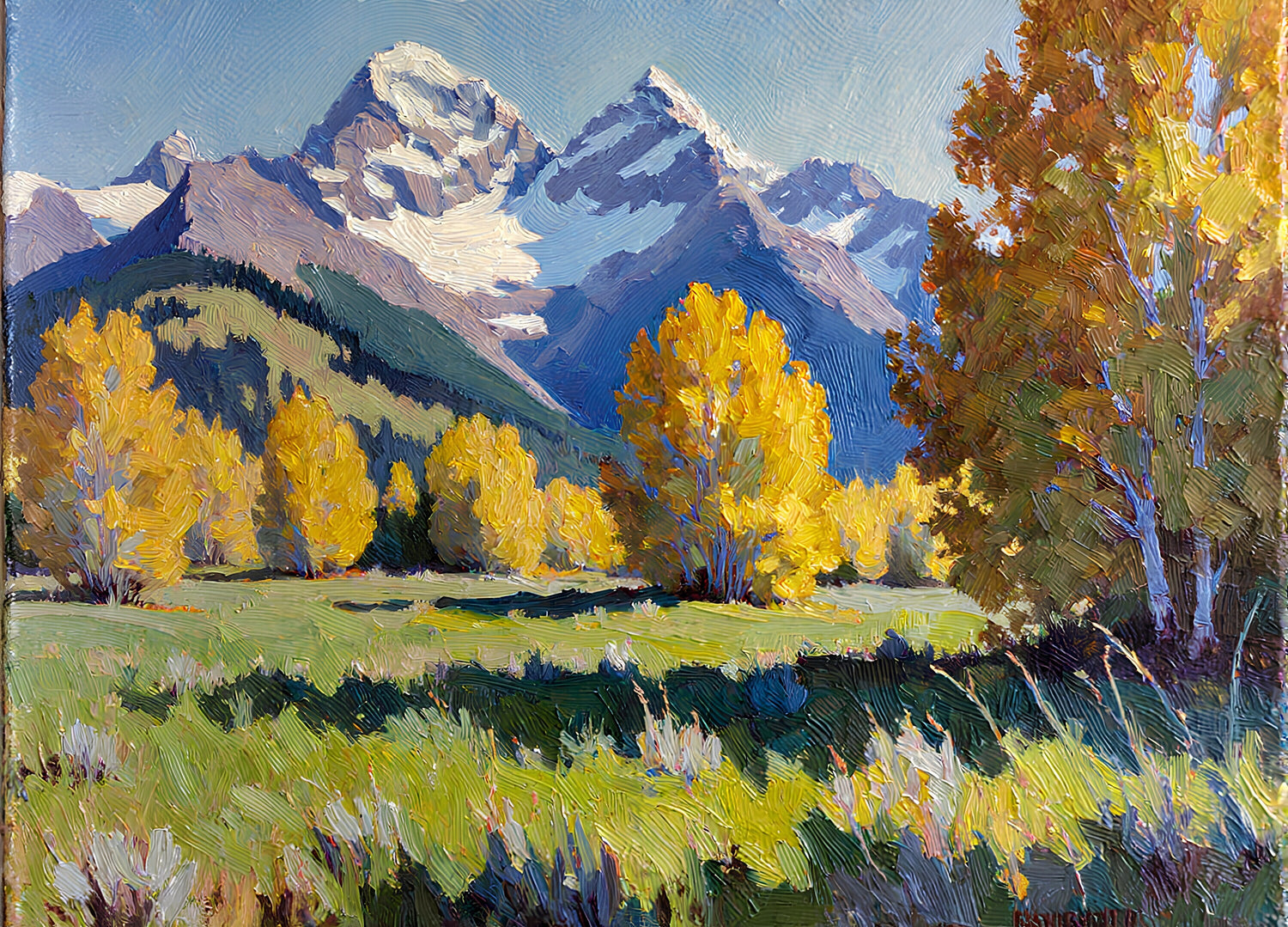 木々が黄色く色づき、後ろの山脈は冠雪している。