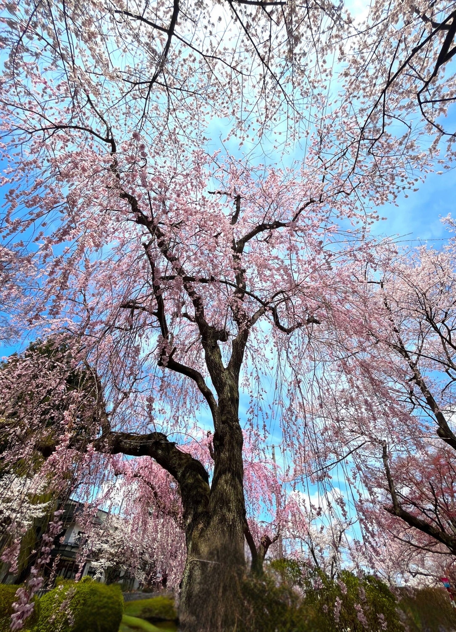岩手県奥州市の水沢公園で大きな枝垂れ桜を見上げています。