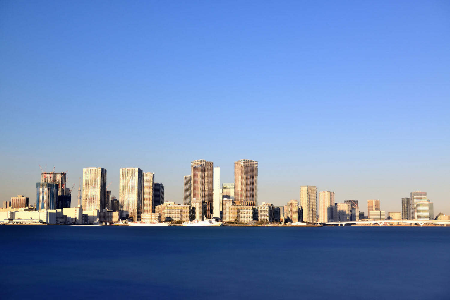 晴れた日の夕方、芝浦ふ頭から晴海ふ頭公園、晴海フラッグ方面を長時間露光にて波、流れを消して撮影。
