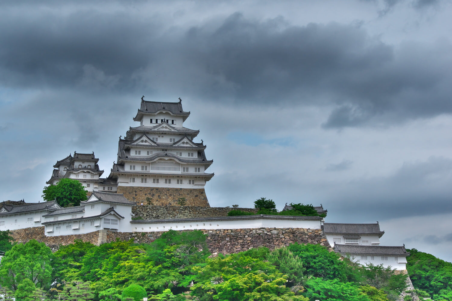 厚い雲が空を覆う中、白壁が際立ち、まるで静けさの中に歴史が息づいているようです。