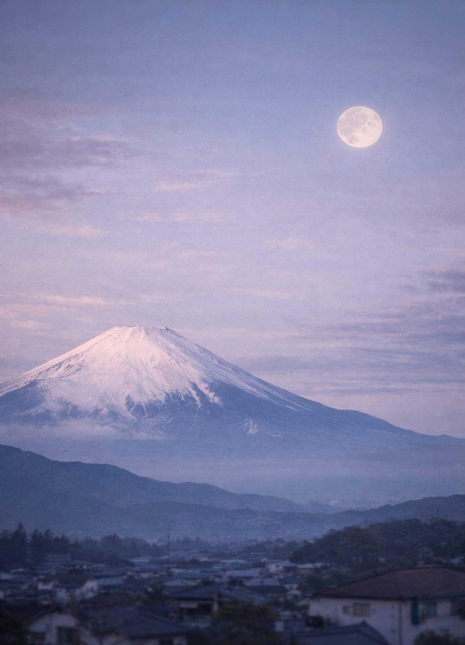 雪を抱いた峰は静かに横たわり、手前の街並みは薄い霞の中へ溶けていく。