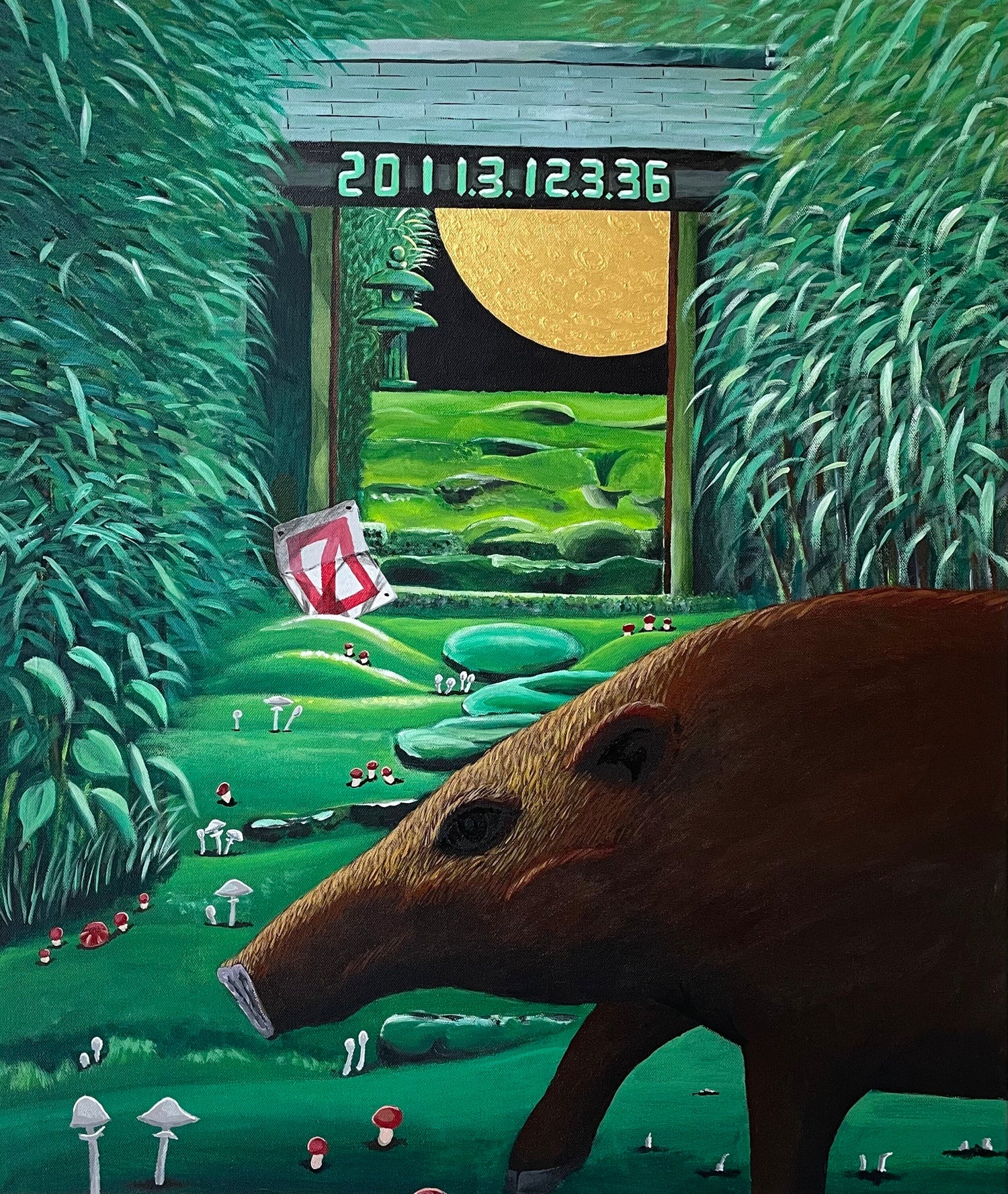 住む人のいない庭は苔に覆われ、イノシシが堂々と歩き回る。