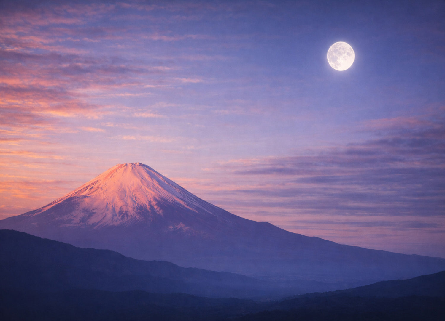 淡い紫と青が溶け合う空に、静かに浮かぶ月。