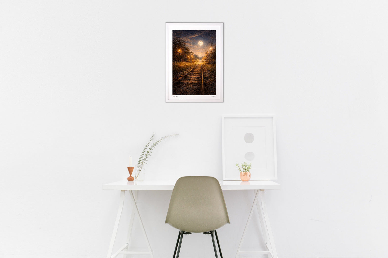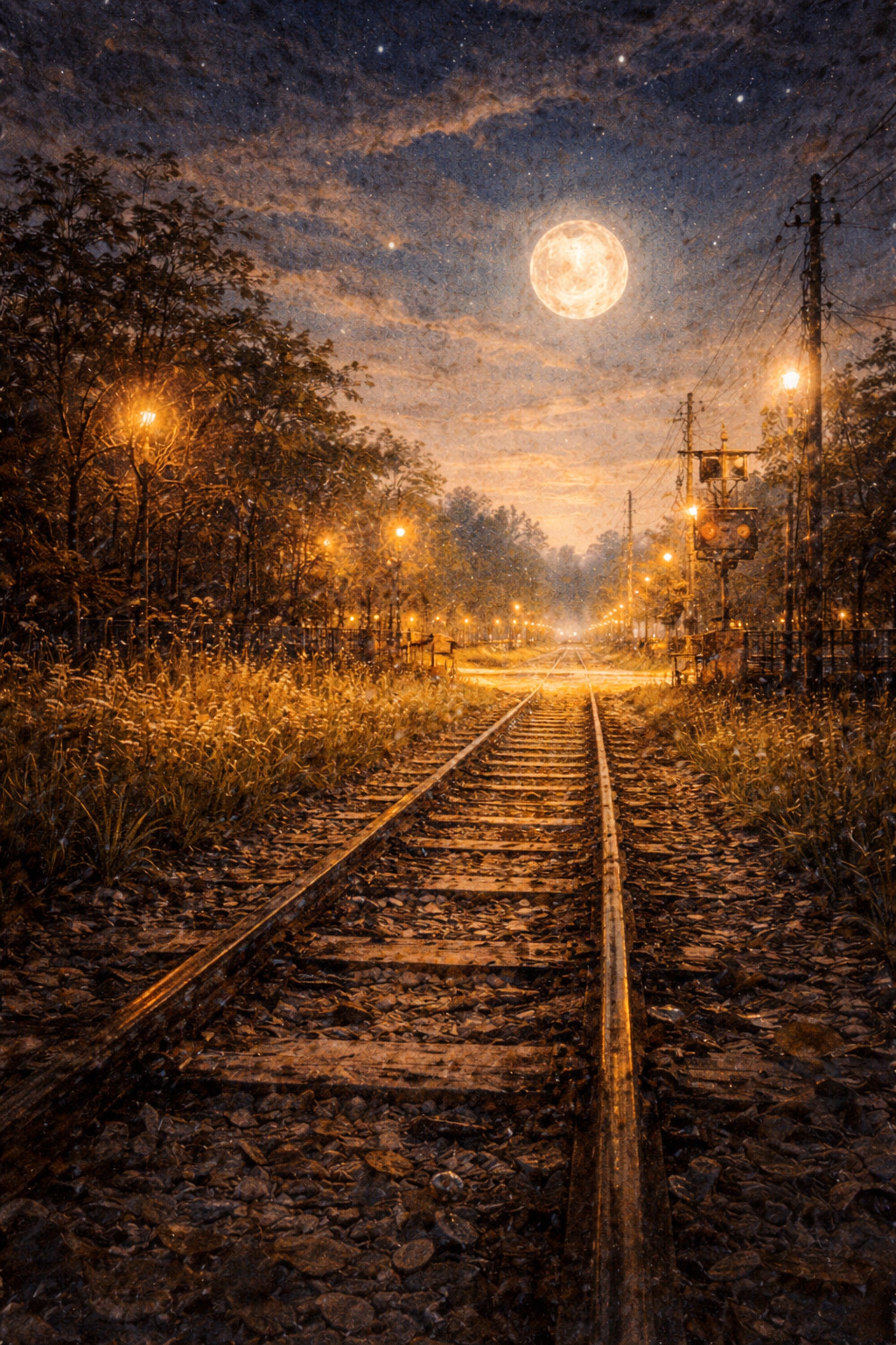 満月が静かに空を照らす夜、どこまでも続く線路を描いた幻想的な風景作品です。