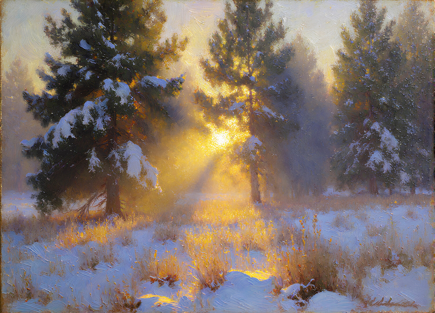 霧のかかった松の木々の間から差し込む黄金色の陽光