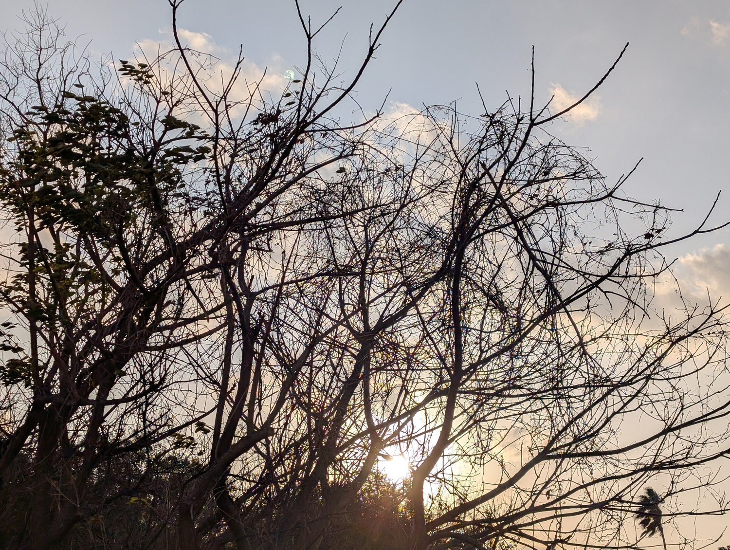 ウォーキング途中に道路脇に立ち並ぶ木から漏れるオレンジ色の夕陽が綺麗で撮りました。